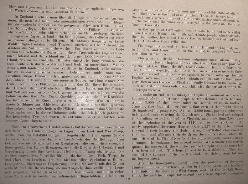 . | English agents, sent to the Palatinate, took advantage of this state of affairs to further increase the flood of emigration. Their efforts were aided by the extremely severe winter of 1708-1709, during which all products of the fields and the vines were destroyed by the frosts and the wines froze in the casks. In the spring of 1709 entire fleets of rafts, boats and skiffs sailed down the river Rhine, laden with unfortunate people, who took with them in bundles, boxes and trunks the few belongings that had been left to them after this terrible time. The emigrants crossed the channel from Holland to England, went to London, and there applied to the English Government for transportation to America. This great multitude of German emigrants caused alarm in England. Soon it became impossible to shelter them. Camps were provided for them at the "Black Heath", near London. Here in a short time about 20,000 people from the Palatinate - accounts in reference to their number are contradictory - were exposed to great sufferings, for the English Government was unable to obtain enough craft for their transportation across the ocean. Charity, liberally bestowed in the beginning, soon relaxed and thousands died, while with the arrival of winter the sufferings increased. To make an end to the misery the English Government sent several thousands of the unfortunate people back to Holland and to Germany. About 3,000 of them were taken to Ireland, where, in northern Munster, they founded a settlement, that even at the present time is distinguished by prosperity. At least 5,000 found paying employment in England, many entering the English army. Six hundred were shipped to Carolina, several hundred to Virginia, and more than 3,000 were at the beginning of the year 1710 sent to New York with the newly appointed Governor Hunter. Only 2,227 of the latter reached the end of their journey, the Hudson river, for 470 died while crossing the ocean, and 250 met their death on Governor's Island, where the authorities of the City of New York, fearing contagious diseases, again encamped the emigrants for several weeks. When finally this terrible quarantine was ended, the wretched people thought that the worst had been endured. This hope proved to be a delusion. They had escaped the tyranny of their native land, but their present lot was no improvement. After the immigrants, placed under the protection of Governor Hunter, had been quartered by him in two camps on both banks of the Hudson, the East and West Camp. south of the Catskill Mountains, the wretched people for several years were exposed to oppressions of all kinds.