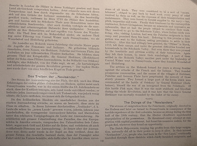 . | They were considered to be a sort of "crown-laborers", obliged to pay back by hard work every penny of relief received by them as well as the expenses of their transportation and maintenance. They were forced to furnish suppies to the navy - tar, pitch, turpentine and rosin. Finally their treatment by the contemptible contractor, Robert Livingstone, became so miserable and oppressive, so unbearable, that at last the people refused to continue their work. They resolved to go to the Schoharie Valley, where Indian chiefs were living, who, visiting London, had seen the Palatine emigrants in their camp and promised them free land. Referring to this promise a delegation was sent to the Indians, asking permission to settle in their territory. After this had willingly been granted, the "Pfälzer" in March, 1713 left their camps, and under the greatest difficulties founded new homesteads in the Schoharie Valley. But even there they were pursued by the insatiable and pittiless [sic] avidity of their tormentors. Again they left their homes, to renew their wanderings. A part of them settled in the Mohawk Valley; another part under the leadership of Conrad Weiser went to Pennsylvania, where they founded Womelsdorf and Heidelberg. The settlers on the Mohawk formed for years a strong frontier against the attacks of the French and the Indians. They founded prosperous communities, and the names of the villages of Herkimer, Palatine and German Flats have perpetuated the memory of those sturdy pioneers. They formed a large part of the forces which were commanded at the battle of Oriskany by General Herkimer (Herkheimer), himself the son of an immigrant from the Palatinate. Of this battle Fisk says, that it was the most stubborn and bloodiest during the whole Revolution, and it was here that the brave General Herkimer was mortally wounded by the bullet of the enemy. The Doings of the "Newlanders" The stream of emigration from the Palatinate, originally directed to the Hudson and later on turned to Pennsylvania in consequence of the terrible experience of the first colonists, became so strong during the first half of the 18th century, that the Elector (Kurfürst) apprehended depopulation of his possessions. He threatened every attempt at emigration with capital punishment, but found his measures useless, for the people fled, wherever they found an opportunity. The Dutch Ship-owners, reaping big profits from this large emigration, naturally did all in their power to keep it alive. In their interest "Newlanders", i.e. people who had been in the "New Land", continually travelled through those districts which chiefly furnished emigrants, and |