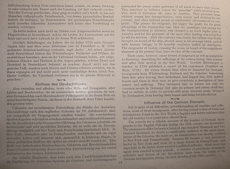 . | pursuaded the people under pretenses of all kinds to leave their homes. They described in brilliant colors the "paradise" which awaited those, who, tired of European life, came to America. They promised those without means free transportation, even money and clothing for the journey, and often induced people in comfortable circumstances to emigrate. The poorer the emigrant, the bigger the profit, for the great advantage of the transaction was, that the passenger, not paying for his transportation in advance, was charged a so much higher price in America and for the payment of the same after landing was compelled to sell his services. After the contract was closed, the victims were finally brought on board of the ship, stowed away in the steerage which, packed with human beings, in its horrible condition baffled all description. The emigrants of to-day, crossing the ocean on board of the magnificent steamers of the present time, have no idea of the contrast. There came, however, many letters of emigrants as well as pamphlets to Germany, describing the sufferings of the writers during their journey and after their arrival in the New World. Gottlieb Mittelberger [1.], a teacher, in 1750 published a report of his experiences (Fankfurt[sic] on Main, 1756). He writes therein that when he departed for Germany, immigrants from Württemberg, Durbach and the Palatine, bemoaning their fate after leaving their fatherland, had begged him with uplifted hands and tears in their eyes, to give everybody a description of their misery and suffering. They entreated him to inform not only the common people in Germany but also its princes and rulers, of all they had to endure, in order to prevent still more innocent souls, betrayed by Newlanders, from leaving their homes and being led into slavery. Influence of the German Element But in spite of all difficulties, notwithstanding all troubles and afflictions, most of those immigrants, after having passed a time of trials and tribulations, found in the New World a happier and better existence than the old country ever could have offered them. The records for a reliable account of the number of German immigrants to the English Colonies during the 18th century are incomplete. The statements differ between a total of one hundred thousand and two hundred thousand, no doubt a considerable addition to the small population of the Colonies, the more so, as immigration was mostly confined to New York and Pennsylvania. German life became a very prominent factor in New York and even to a large extent in Pennsylvania, and especially in the latter state secured a political influence, which never has again been reached in later periods. A number of prominent statesmen, scholars and heroes of the Revolution came from the ranks of the German immigration during the first decades of the 18th century. [1.] Left Column, Paragraph 3 Translator's note: The sentence in German states "Gottlieb Mittelberger, a teacher who went to Pennsylvania in 1750 and who published a description of his journey in Frankfurt on the Mainz in 1756..." Return to text