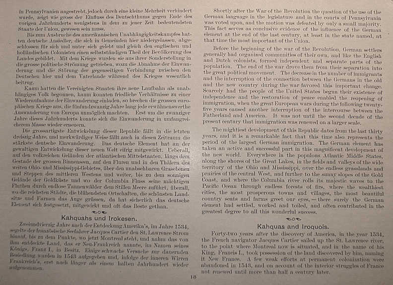 . | Shortly after the War of the Revolution the question of the use of the German language in the legislature and in the courts of Pennsylvania was voted upon, and the motion was defeated by only a small majority. This fact serves as conclusive evidence of the influence of the German element at the end of the last century, at least in the state named, at that time the most important of the Union. Before the beginning of the war of the Revolution, German settlers generally had organized communities of their own, and like the English and Dutch colonists, formed independent and separate parts of the population. The end of the war drove them from their separation into the great political movement. The decrease in the number of immigrants and the interruption of the connection between the Germans in the old and the new country during the war favored this important change. Scarcely had the people of the United States begun their existence of independence and the restoration of peace enabled the reopening of immigration, when the great European wars during the following twenty-five years caused another interruption of the intercourse between the Fatherland and America. It was not until the second decade of the present century that immigration was renewed on a larger scale. The mightiest development of this Republic dates from the last thirty years, and it is a remarkable fact that this time also represents the period of the largest German immigration. The German element has taken an active and successful part in this magnificent development of the new world. Everywhere in the populous Atlantic Middle States, along the shores of the Great Lakes, in the fields and valleys of the wide territory of the Ohio and Mississippi, over the endless grasslands and prairies of the central West, and further to the sunny slopes of the Gold Coast, and where the Columbia river rolls its majestic waves to the Pacific Ocean through endless forests of firs, where the wealthiest cities, the most prosperous towns and villages, the most beautiful country seats and farms greet our eyes, - there surely the German element had settled, worked and toiled, and often contributed in the greatest degree to all this wonderful success. Kahquas and Iroquois Forty-two years after the discovery of America, in the year 1534, the French navigator Jacques Cartier sailed up the St. Lawrence river, to the point where Montreal now is situated, and in the name of his king, Francis I, took possession of the land discovered by him, naming it New France. A few weak efforts at permanent colonization were abandoned in 1543, and on account of the interior struggles of France not renewed until more than half a century later.