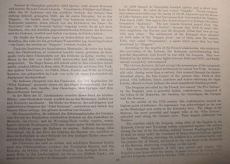 According to the reports of the French missionaries, who undertook the conversion of the Indians, the Kahquas, notwithstanding their peaceful disposition, were forced to war with the Iroquois. They were defeated by the latter in many fights between 1640 and 1655, and finally almost completely exterminated. The victors, however, did not occupy the possessions of the conquered, but remained in their original settlements in central New York. Occasionally only, during more than a century, they roamed through the district described above, the Erie County of the present time, which at that period, with buffaloes, bears, panthers and wolves enlivening its virgin forests, offered to those Indians the most magnificent hunting grounds. The Iroquois (so called by the French, but named "the Five Nations" by the English) were a powerful Indian confederation, composed of the tribes of the Mohawks, the Oneidas, the Onondagas, the Cayugas and the Senecas. In the middle of the 17th century this confederation reached the highest point of influence: its supremacy was acknowledged as far west as the Mississippi and south as the Kentucky river [1.]. The village of the Senecas, the most powerful and largest tribe of the "Five Nations", extended west along the Genesee river. Their largest settlement was Geneseo. The cruelties which the Iroquois, being allied of the English, in the Mohawk, Cherry and Wyoming valleys committed against the settlers during the war of the Revolution, induced General Washington in 1779, to send an army under the command of Major-General Sullivan against the Indians. Sullivan, defeating the redskins in a victorious battle near the present city of Elmira, advanced to the very heart of the dominions of the Senecas, destroying everything on his march. The remaining members of this once proud and mighty tribe founded a new home after the treaty of peace between the United States and the Iroquois, concluded in October, 1784 at Fort Stanwix, the Rome [1.] Page 16, paragraph 5 Translator's note: the German text says "as far south as Kentucky." Return to text Return to Indexes Go on to Pages 17 - 21 Revised September 9, 2004