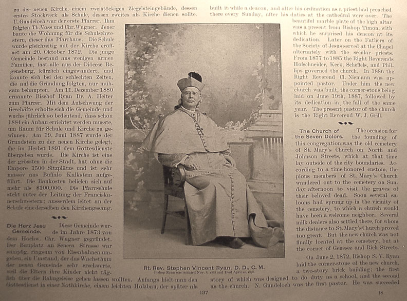 | . | built it while a deacon, and after his ordination as a priest had preached there every Sunday, after his duties at the cathedral were over. The beautiful marble plate of the high altar was a present from Bishop Timon, with which he surprised his deacon at its dedication. Later on the Fathers of the Society of Jesus served at the Chapel alternately with the secular priests. From 1877 to 1885 the Right Reverends Hofschneider, Keck, Scheffels, and Phillips governed the church. In 1886 the Right Reverend Cl. Niemann was appointed pastor. Under him the new church was built, the corner-stone being laid on June 19th, 1887, followed by its dedication in the fall of the same year. The present pastor of the church is the Right Reverend W.J. Grill. The Church of the Seven Dolors The occasion for the founding of this congregation was the old cemetery of St. Mary's Church on North and Johnson Streets, which at that time lay outside of the city boundries. According to a time-honored custom, the pious members of St. Mary's Church wandered out to the cemetery on Sunday afternoon to visit the graves of their beloved dead. Soon several saloons had sprung up in the vicinity of the cemetery, to which a church would have been a welcome neighbor. Several milk dealers also settled there, for whom the distance to St. Mary's Church proved too great. But the new church was not finally located at the cemetery, but at the corner of Genesee and Rich Streets. On June 2, 1872, Bishop S.V. Ryan laid the corner-stone of the new church, a two-story brick building; the first story of which was designed to do duty as a school, and the second as the church. N. Gundeloch was the first pastor. He was succeeded Caption under picture at center reads Rt. Rev. Stephen Vincent Ryan, D.D., C.M.
