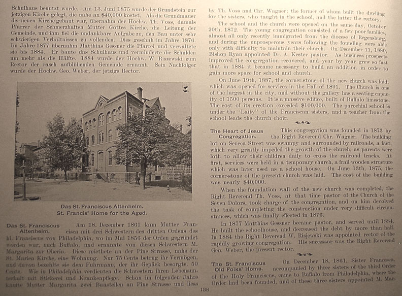 | . | by Th. Voss and Chr. Wagner; the former of whom built the dwelling for the sisters, who taught in the school, and the latter the rectory. The school and the church were opened on the same day, October 20th, 1872. The young congregation consisted of a few poor families, almost all only recently immigrated from the diocese of Regensburg, and during the unprosperous years following the founding were able only with difficulty to maintain their church. On December 11, 1880, Bishop Ryan appointed Dr. A. Kester pastor. [1] As business prospects improved the congregation recovered, and year by year grew so fast that in 1884 it became necessary to build a addition in order to gain more space for school and church. On June 19th, 1887, the corner-stone of the new church was laid, which was opened for services in the Fall of 1891. The Church is one of the largest in the city, and without the gallery has a seating capacity of 1500 persons, It is a massive edifice, built of Buffalo limestone. The cost of its erection exceeded $100,000. The parochial school is under the "Laity" of the Franciscan sisters, and a teacher from the school leads the church choir. The Heart of Jesus Congregation This congregation was founded in 1873 by the Right Reverend Chr. Wagner. The building lot on Seneca Street was swampy and surrounded by railroads, a fact, which very greatly impeded the growth of the church, as parents were loth to allow their children daily to cross the railroad tracks. At first, services were held in a temporary church, a frail wooden structure which was later used as a school house. On June 13th, 1875, the corner-stone of the present church was laid. The cost of the building was nearly $40,000. When the foundation wall of the new church was completed, the Right Reverend Th. Voss, at that time pastor of the Church of the Seven Dolors, took charge of the congregation, and on him devolved the task of completing the construction under very difficult circumstances, which was finally effected in 1876. In 1877 Matthias Gessner became pastor, and served until 1884. He built the schoolhouse, and decreased the debt by more than half. In 1884 the Right Reverend W. Risjewski was appointed rector of the rapidly growing congregation. His successor was the Right Reverend Geo. Weber, the present rector. The St. Franciscus Old Folks' Home On December 18, 1861, Sister Francesca, of the Holy Franciscus, came to Buffalo from Philadelphia, where the Order had been founded, and of these three sisters appointed M. Margarita Caption under picture at left center reads St. Francis' Home for the Aged [1]The German text reads "On December 11, 1880 Bishop Ryan appointed Dr. A. Heiter pastor." Return to text |