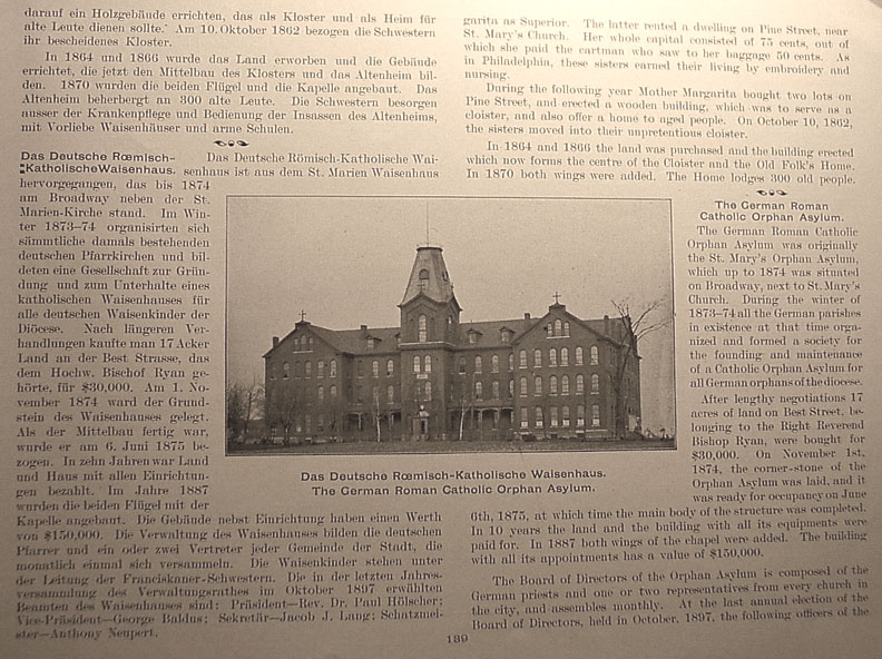| . | as Superior. The latter rented a dwelling on Pine Street, near St. Mary's Church. Her whole capital consisted of 75 cents, out of which she paid the cartment who saw to her baggage 50 cents. As in Philadelphia, these sisters earned their living by embroidery and nursing. During the following year Mother Margarita bought two lots on Pine Street, and erected a wooden building, which was to serve as a cloister, and also offer a home to aged people. On October 10, 1862, the sisters moved into their unpretentious cloister. In 1864 and 1866 the land was purchased and the building erected which now forms the centre of the Cloister and the Old Folk's Home. In 1870 both wings were added. The Home lodges 300 old people. The German Roman Catholic Orphan Asylum The German Roman Catholic Orphan Asylum was originally the St. Mary's Orphan Asylum, which up to 1874 was situated on Broadway, next to St. Mary's Church. During the winter of 1873-74 all the German parishes in existence at the time organized and formed a society for the founding and maintenance of a Catholic Orphan Asylum for all German orphans of the diocese. After lengthy negotiations 17 acres of land on Best Street, belonging to the Right Reverend Bishop Ryan, were bought for $30,000. On November 1st, 1874, the corner-stone of the Orphan Asylum was laid, and it was ready for occupancy on June 6th, 1875, at which time the main body of the structure was completed. In 10 years the land and the building with all its equipment were paid for. In 1887 both wings of the chapel were added. The building with all its appointments has a value of $150,000. The Board of Directors of the Orphan Asylum is composed of the German priests and one or two representatives from every church in the city, and assembles monthly. At the last annual election of the Board of Directors, held in October, 1897, the following officers of the Caption under picture at center reads The German Roman Catholic Orphan Asylum