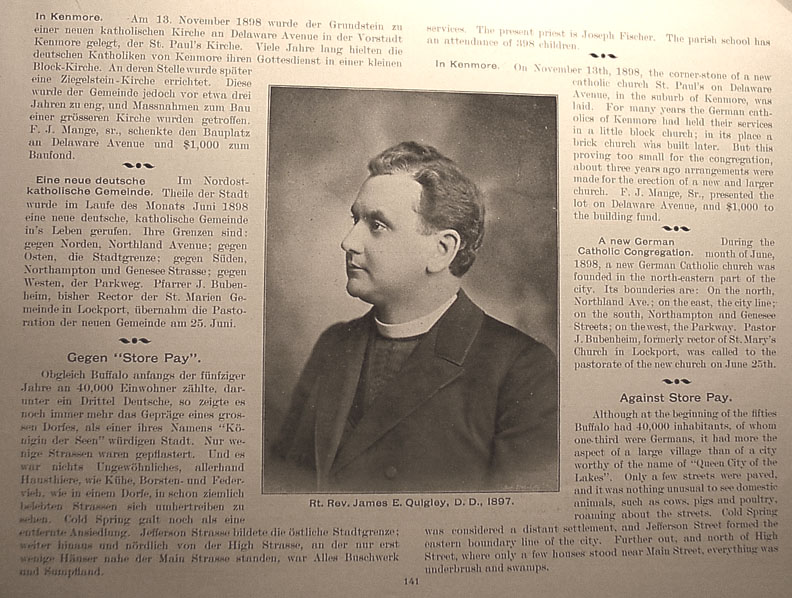 services. The present priest is Joseph Fischer. The parish school has an attendance of 398 children. In Kenmore On November 13th, 1898, the corner-stone of a new catholic church St. Paul's on Delaware Avenue, in the suburb of Kenmore, was laid. For many years the German catholics of Kenmore had held their services in a little block church; in its place a brick church was built later. But this proving too small for the congregation, about three years ago arrangements were made for the erection of a new and larger church. F.J. Mange, Sr. presented the lot on Delaware Avenue, and $1,000 to the building fund. A new German Catholic Congregation During the month of June, 1898, a new German Catholic church was founded in the north-eastern part of the city. Its boundries are: On the north, Northland Ave.; on the east, the city line; on the south, North Hampton and Genesee Streets; on the west, the Parkway. Pastor J. Bubenheim, formerly rector of St. Mary's Church in Lockport, was called to the pastorate of the new church on June 25th. Against Store Pay Although at the beginnings of the fifties Buffalo had 40,000 inhabitants, of whom one-third were Germans, it had more the aspect of a large village than of a city worthy of the name of "Queen City of the Lakes". Only a few streets were paved, and it was nothing unusual to see domestic animals, such as cows, pigs and poultry, roaming about the streets. Cold Spring was considered a distant settlement, and Jefferson Street formed the eastern boundary line of the city. Further out, and north of High street, where only a few houses stood near Main Street, everything was underbrush and swamps. Caption under picture at center reads Rt. Rev. James E. Quigley, D.D., 1897 Return to Indexes Go on to Pages 142 - 146