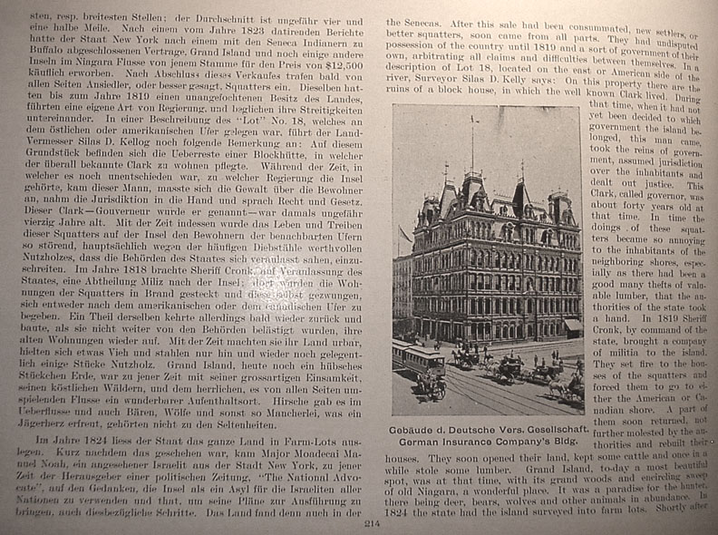 | . | the Senecas. After this sale had been consummated, new settlers, or better squatters, soon came from all parts. They had undisputed possession of the country until 1819 and a sort of government of their own, arbitrating all claims and difficulties between themselves. In a description of Lot 18, located on the east or American side of the river, Surveyor Silas D. Kelly says: On this property there are the ruins of a block house, in which the well known Clark lived. During that time, when it had not yet been decided to which government the island belonged, this man came, took the reins of government, assumed jurisdiction over the inhabitants and dealt out justice. This Clark, called governor, was about forty years old at that time. In time the doings of these squatters became so annoying to the inhabitants of the neighboring shores, especially as there had been a good many thefts of valuable lumber, that the authorities of the state took a hand. In 1819 Sheriff Cronk, by command of the state, brought a company of militia to the island. They set fire to the houses of the squatters and forced them to go to either the American or Canadian shore. A part of them soon returned, not further molested by the authorities and rebuilt their houses. They soon opened their land, kept some cattle and once in a while stole some lumber. Grand Island, to-day a most beautiful spot, was at that time, with its grand woods and encircling sweep of old Niagara, a wonderful place. It was a paradise for the hunter, there being deer, bear, wolves and other animals in abundance. In 1824 the state had the island surveyed into farm lots. Shortly after Caption under picture at right center reads German Insurance Company's Bldg.