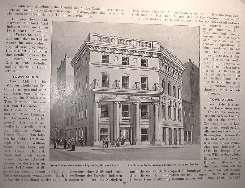 | . | that, Major Mordecai Manual Noah, a well known Israelite from New York and at the time the publisher of the"National Advocate" thought of making the island an asylum for Israelites of all nations and started out to put his plan into execution. The land found many buyers, but the object of Major Noah was not realized; opposition to him developed in all parts but he was always able to defend himself.[1] The island really came into prominence first in 1849, when farming and cattle raising as well as fruit raising were in their bloom. To-day the town has quite a population, several churches, good schools and roads. Town Alden Town Alden is situated in the eastern part of Erie County bordering east on Genesee County, north on the town of Newstead, west on Lancaster and south on Marilla and on the town of Bennington, Genesee Co. The first settler was an Irishman, Moses Penno, who was followed in 1810 by Joseph Freeman, William Snow, John Estabrook and Arunah Hibbard. After a while there came more settlers until the war of 1812 stopped all immigration and new settlements. After the war the immigration started up again, but we find among these settlers hardly any German names until 1830 - 1840. In 1843 Caption under picture at center reads New building for the American Express Co., Main and Erie Sts. [1] The German text, on page 215, states "he [Major Noah] was besieged on all sides, but he always knew how to defend himself with ability and humor."