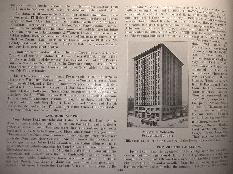 the Buffalo & Attica Railroad, now a part of the Erie system was built, touching Alden, and in 1853 the Buffalo & Rochester Co., now consolidated with the N.Y. Central R.R. built a line through the northern part of the town and finally in 1883 the N.Y. Lackawanna & Western built a third line between the other two through a part of the town, so that this part of Erie County had quite a boom. Town Alden was at first a part of Town Batavia in Genesee County and was consolidated in 1804 with the Town Willinck in the same county. At the big re-organization the territory became a part of Town Clarence in Niagara County. On March 29th, 1823, the Town of Alden was formed by an act of the legislature. The first meeting of the new town was held on May 27th, 1823 in Washburn Parker's house; the names of the first town officials were: Edmond Badger, Supervisor, Homer Hendee, Town Clerk, William H. Dayton and Jonathan Larkin, Assessors, Thomas Durkee, Collector, Thomas Farnsworth and John Wey, inspectors of the poor, Nathan Willis, James C. Thompson and Jesse Gressman, Highway Commissioners, Samuel Slade, Silas Snow and Thomas Gregg, School Commissioners, Homer Hendee, Paul White and Joseph Perry, School Inspectors, Thomas Durkee and Simon Hill, constables. The first Justice of the Peace was Moses Case. The Village of Alden From 1823 dates the existence of the Village of Alden as in that year a post office was opened there, the first postmaster of which was Joseph Freeman; nevertheless there were only two block houses in the village at that time and a so-called frame house, belonging to Thomas Farnsworth, who also founded a tannery. The growth of the village Caption under picture at right center reads Prudential Building Return to Indexes Go on to Pages 217 - 221