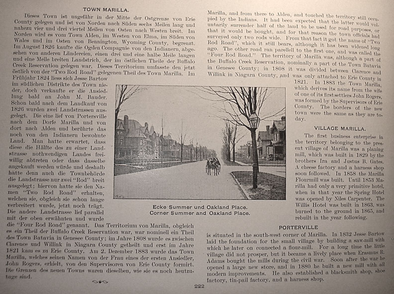 | . | Marilla, and from there to Alden, and touched the territory still occupied by the Indians. It had been expected that the latter would voluntarily surrender half of the land to be used for road purposes, or that it would be bought, and for that reason the town officials had surveyed only two rods wide. From that fact it got the name of "Two Rod Road", which it still bears, although it has been widened long ago. The other road ran parallel to the first one, and was called the "Four Rod Road." The territory of Marilla was, although a part of the Buffalo Creek Reservation, nominally a part of the Town Batavia in Genesee County; in 1808 it was divided between Clarence and Willink in Niagara County, and was only attached to Erie County in 1821. In 1883 the Town Marilla, which derives its name from the wife of one of its first settlers John Rogers, was formed by the Supervisors of Erie County. The borders of the new town were the same as they are to-day. Village Marilla The first business enterprise in the territory belonging to the present village of Marilla was a planing mill, which was built in 1829 by the brothers Ira and Justus B. Gates. A cheese factory and a harness shop soon followed. In 1858 the Marilla Flourmill was built. Until 1853 Marilla had only a very primitive hotel, which in that year the Spring Hotel was opened by Niles Carpenter. The Willis Hotel was built in 1863, was burned to the ground in 1865, and rebuilt in the year following. Porterville is situated in the south-west corner of Marilla. In 1832 Jesse Bartow laid the foundation for the small village by building a saw-mill with which he later on connected a flour-mill. For a long time the little village did not prosper, but it became a lively place when Erasmus R. Adams bought the mills during the civil war. Soon after the war he opened a large new store, and in 1880 he built a new mill with all modern improvements. He established a blacksmith shop, shoe factory, tin-pail factory, and a harness shop. Caption under picture at center reads Corner Summer and Oakland Place