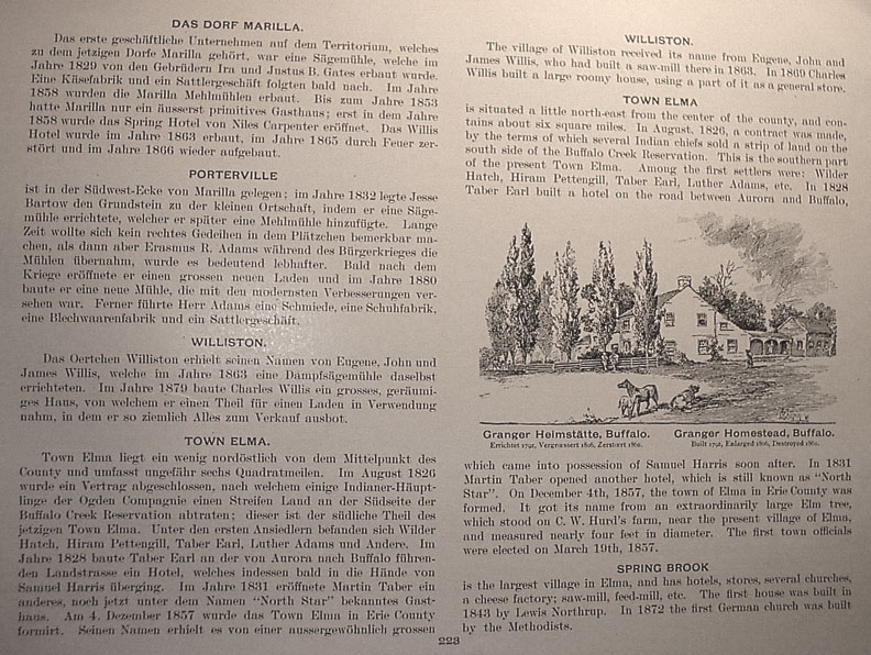 | . | Williston The village of Williston received its name from Eugene, John and James Willis, who had built a saw-mill there in 1863. In 1869 Charles Willis built a large roomy house, using a part of it as a general store. Town Elma is situated a little north-east from the center of the county, and contains about six square miles. In August, 1826, a contract was made, by the terms of which several Indian chiefs sold a strip of land on the south side of the Buffalo Creek Reservation.[1] This is the southern part of the present Town Elma. Among the first settlers were: Wilder Hatch, Hiram Pettengill, Taber Earl, Luther Adams, etc. In 1828 Taber Earl built a hotel on the road between Aurora and Buffalo, which came into the possession of Samuel Harris soon after. In 1831 Martin Taber opened another hotel, which is still known as "North Star". On December 4th, 1857, the town of Elma in Erie County was formed. It got its name from an extraordinarily large Elm tree, which stood on C.W. Hurd's farm, near the present village of Elma, and measured nearly four feet in diameter. The first town officials were elected on March 19th, 1857. Spring Brook is the largest village in Elma, and has hotels, stores, several churches, a cheese factory; saw-mill, feed-mill, etc. The first house was built in 1843 by Lewis Northrup. In 1872 the first German church was built by the Methodists. Caption under picture at right center reads Granger Homestead, Buffalo - Built 1791, Enlarged 1806, Destroyed 1860 [1]The German text reads "In August 1826 a contract was made by which several Indian chiefs turned over a strip of land on the south side of the Buffalo Creek Reservation to the Ogden Company; this is the southern portion of the current Town of Elma." Return to text |