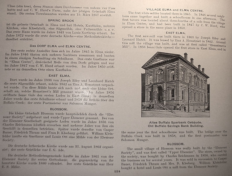 | . | Village Elma and Elma Centre The first white settler located there in 1845. In 1846 several neighbors came together and built a schoolhouse in one afternoon. The first tavern was located about three-fourths of a mile from the village in Elma Centre, and had been built in 1847 by C.W. Hurd, who opened a store in the same place in 1850. East Elma The first saw-mill was built there in 1863 by Joseph Riley and Leonard Hatch. It was leased by Zina A. Hemstreet in 1842. Around this mill the village was built, and was at first called Hemstreet's Mill. In 1856 Isaac Gale opened the first store in East Elma, and in the same year the first schoolhouse was built. The bridge over the Buffalo Creek was built in 1858, and the first postmaster was Solomon Munger. Blossom The small village of Blosson was built by the "Ebenezer Society", and was first called "Upper Ebenezer". The store, owned by the society, was bought by Charles Reichmann in 1856, who carried the business on for several years. It was sold in succession to Caspar Bauer, Friedrich Thram and Mrs. D. Kleeberg. William Kleinfelder bought a hotel and Louis Ott a mill from the Ebenezer Society. Caption under picture at right center reads Old Buffalo Savings Bank Building