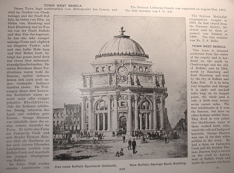 | . | The German Lutheran Church was organized on August 31st, 1862. The first minister was I.G. Ade. The German Methodist congregation bought in 1861 its first church from the Ebenezer Society, the church used by them at present was finished in 1880. The first minister was Mr. E.S. Miller. Town West Seneca This town is situated northwest from the center of the county and is bordered on the north by Cheektowaga and the city of Buffalo, east by Elba, south by Hamburg and East Hamburg and west by the city of Buffalo and Lake Erie. It is in form very irregular and though it is eight and one-half miles long on its longest point, the whole area is only a little over twenty seven square miles. The first inhabitants of it were the Senecas, but later on other Indians settled there. They lived in very primitive blockhouses, many of them worked hard, cultivated the soil and had good harvests.[1] George Jimeson was one of the first white settlers in the town. He had a farm on Cazenovia Creek and his brother Thomas Jimeson kept a tavern on the road to Aurora, west of Buffalo Creek and inside the present city limits. Caption under picture at center reads New Buffalo Savings Bank Building [1]The German text reads "The homes of these resident Redskins were more or less primitive blockhouses; many of the Indians worked hard, cultivated the land, and had good harvests." Return to text