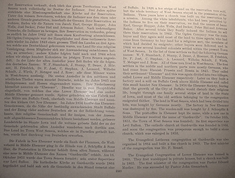 of Buffalo. In 1826 a few strips of land on the reservation were sold, but the whole territory of West Seneca stayed in possession of the Indians. Three years later a church was built on the reservation by a mission. Among the white inhabitants, who had been permitted by the Indians to live on their reservation, we find the names of Isaac Earl, George Hopper, John Wells, Joel Decker, Peter Piel and Artemas [1] Baker. After several trials they finally induced the Indians to sell them their reservation in 1842. The Odgen Company was the main buyer and they again sold most of the land to three agents, who had come from German to buy land for a religious sect, the members of which had decided to emigrate; other buyers soon followed and in 1844 we see several hundred colonists settled in the present Town of West Seneca. In the list of these settlers we find the following German names: W.T. Stambach, J. Stamp, J. Deuer, J. Hoerner, H. Friedrick, Dr. F. Jost, C. Stephan, A. Leonard, Wilhelm Schudt, J. Wirth, T. Metzger and J. Rose. All of these men lived in West Seneca. The first had come from Rhenish Prussia and Hessia in 1845. They called their settlement "Ebenezer" and this was again divided into two villages, called Lower and Middle Ebenezer respectively. Later on they built a factory and a mill on Buffalo Creek above Middle Ebenezer and called the small hamlet New Ebenezer. In 1856 the Ebenezer Society, fearing that the growth of the city of Buffalo would disturb their religious life, bought through one family several strips of land in the State of Iowa, and most of the old settlers belonging to the congregation emigrated thither.[2] The land in West Seneca, which had been divided into lots, was bought by Germans mostly. The factory in New Ebenezer was destroyed by fire. The woolen-mill was bought by H. Schoepflin & Sons. The post-office in Ebenezer kept is name, while a new one in Middle Ebenezer received the name of "Gardenville". On October 16th, 1851 the Town of West Seneca was founded; its first supervisor was Levi Ballou. The catholic church at Gardenville was founded in 1864, and soon the congregation was prosperous enough to built a stone church, which was enlarged in 1853. The Evangelical Lutheran congregation at Gardenville was also organized in 1864 and built a fine church in 1869. The first minister of the congregation was Mr. F. Menzel. The Evangelical Congregation of Lower Ebenezer was formed in 1860. They first worshipped in private houses, but a church was built in 1865. The first minister of the congregation was Pastor Edward Mueller. He was succeeded by Pastor John Grenzelbach. [1] The German text spells the name "Artemus". Return to text [2] The German text reads "Fearing the possible influences of the outside world on their religious community and their spiritual way of life by the ever-growing proximity of the city of Buffalo and the influx of many other Germans, the congregation in 1856 purchased a larger piece of land in the state of Iowa and the larger portion of the congregation of older settlers moved there en mass." Return to text Return to Indexes Go on to Pages 227 - 231