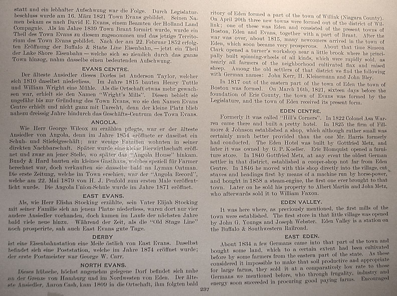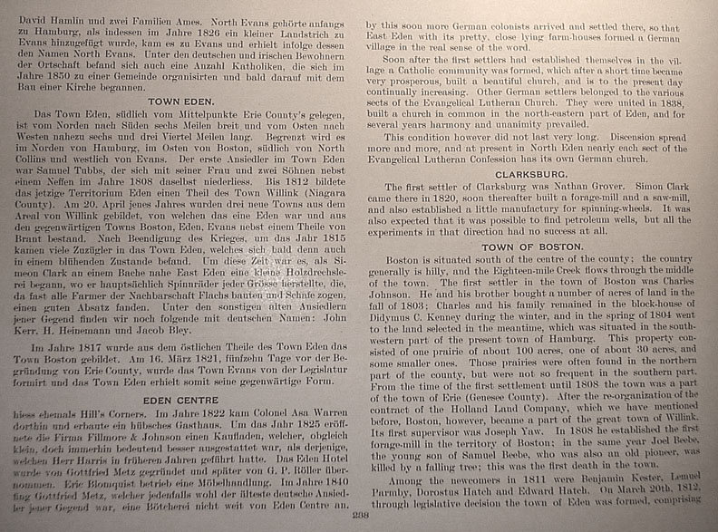 | . | territory of Eden formed a part of the town of Willink (Niagara County). On April 20th three new towns were formed out of the district of Willink; one of these was Eden and consisted of the present towns of Boston, Eden and Evans, together with a part of Brant. After the war was over, about 1815, many newcomers arrived in the town of Eden, which soon became very prosperous. About that time Simeon Clark opened a turner's workshop near a little brook where he principally built spinning-wheels of all kinds, which were rapidly sold, as nearly all farmers of the neighborhood cultivated flax and raised sheep. Among the old settlers of that district we find the following German names: John Kerr, H. Kleinemann and John Bley. In 1817 out of the eastern part of the town of Eden the town of Boston was formed. On March 16th, 1821, sixteen days before the foundation of Erie County, the town of Evans was formed by the Legislature, and the town of Eden received its present form. Eden Centre Formerly it was called "Hill's Corners". In 1822 Colonel Asa Warren came there and built a pretty hotel. In 1825 the firm of Fillmore & Johnson established a shop, while although rather small was certainly much better provided than the one Mr. Harris formerly had conducted. The Eden Hotel was built by Gottfried Metz, and later it was owned by G.P. Koeller.[1] Eric Blomquist opened a furniture store. In 1840 Gottfried Metz, at any event the oldest German settler in that district, established a cooper-shop not far from Eden Centre. In 1846 he moved with this shop directly into the village, cut staves and headings first by means of a machine run by horsepower, and bought in 1858 a steam-engine, the first one ever brought to that town. Later on he sold his property to Albert Martin and John Metz, who afterwards sold it to William Faxon.[2] Eden Valley It was here where, as previously mentioned, the first mills of the town were established. The first store in that little village was opened by John G. Youngs and Joseph Webster. Eden Valley is a station on the Buffalo & Southwestern Railroad. East Eden About 1834 a few Germans came into that part of the town and bought some land, which to a certain extent had been cultivated before by some farmers from the eastern part of the state. As these considered it impossible to make that soil productive and appropriate for large farms, they sold it at a comparatively low rate to those Germans we mentioned before, who through frugality, industry and energy soon succeeded in procuring good paying farms. Encouraged [1] The German text gives the name as "G.P. Röller" [Roeller]. Return to text [2] The German text gives the name as "William Paxon". Return to text