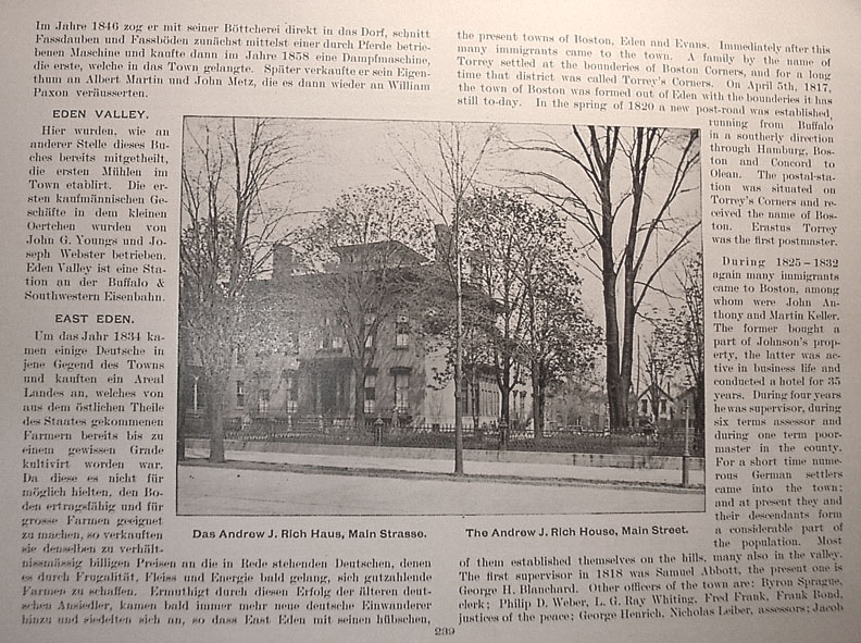 | . | the present towns of Boston, Eden and Evans. Immediately after this many immigrants came to the town. A family by the name of Torrey settled at the boundries of Boston Corners, and for a long time that district was called Torrey's Corners. On April 5th, 1817, the town of Boston was formed out of Eden with the boundries it has still to-day. In the spring of 1820 a new post-road was established, running from Buffalo in a southerly direction through Hamburg, Boston and Concord to Olean. The postal-station was situated on Torrey's Corners and received the name of Boston. Erastus Torrey was the first postmaster. During 1825 - 1832 again many immigrants came to Boston, among whom were John Anthony and Martin Keller. The former bought a part of Johnson's property, the latter was active in business life and conducted a hotel for 35 years. During four years he was supervisor, during six terms assessor and during one term poor-master in the county. For a short time numerous German settlers came into the town; and at present they and their descendants form a considerable part of the population. Most of them established themselves on the hills, many also in the valley. The first supervisor in 1818 was Samuel Abbott, the present one is George H. Blanchard. Other officers of the town are: Byron Sprague, clerk; Philip D. Weber, L.G. Ray Whiting, Fred Frank, Frank Bond, justices of the peace; George Henrich, Nicholas Leiber, assessors; Jacob Caption under picture at center reads The Andrew J. Rich House, Main Street