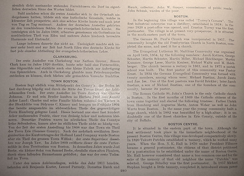 | . | Hauck, collector; John W. Gasper, commissioner of public roads; John Schunk, warden of the poor. Boston In the beginning this village was called "Torrey's Corners". The first industrial enterprise was a distillery, established in 1818; in the year 1820 a post-office was opened, and Erasmus Torrey [1] was the first postmaster. The village is at present very prosperous; it is situated in the south-eastern part of the town. The German St. Paul's Church was incorporated in 1857. The community bought the old Presbyterian Church in North Boston, completed the same, and used it for a church. The Evangelical Lutheran St. Matthias Community was organized on April 14th, 1854, by the following members: Jacob Kettern, George Schuster, Martin Schuster, Martin Miller, Michael Heichberger, Martin Kummer, George Leese, Martin Keniser, Michael Waltz and M. Heichberger. The church became a rectory in 1861 and in 1875 a parish school was built. The first pastor of this community was Pastor Ernst. In 1834 the German Evangelical Community was formed with twenty members, among whom were: Michael Bastian, Jacob Jautz and Jas. Iss.[2] One of the first pastors was David Brickler; later Jacob Bastian, a son of Michael Bastian, one of the founders of the community, became its pastor. The Roman Catholic St. John's Church is the only Catholic church in Boston. In the first months of 1869 the Catholic citizens of the town came together and elected the following trustees: Father Uhrich from Hamburg and Augustus Mertz, Anton Weber as well as John Wurtz from Boston. In the same year the young community built a large church, which in 1882 was beautified by a high-altar; it is undoubtedly one of the finest churches in Erie County, outside of the city of Buffalo. Boston Centre It is situated in the eastern part of the town. Although the first settlement took place in the immediate neighborhood of the present Boston Centre, this village was developed comparatively slowly. In 1820 Talcott Patchin established a tannery, which he worked many years. When the Hon. N.K. Hall in 1850 under President Fillmore became a general postmaster, the citizens of that district petitioned for a post-station to be established under the name of Boston Centre. Mr. Hall however considered that name a too common one and for the sake of the memory of that old neighbor the name "Patchin" was selected. George Brindley was the first postmaster. In 1857 Michael Stephan bought a little tannery, completed it, introduced steam power [1] The German text gives the name as "Erastus Torrey", as it did in previous pages. Return to text [2] The German text gives the name as "Jos. Iss". Return to text
