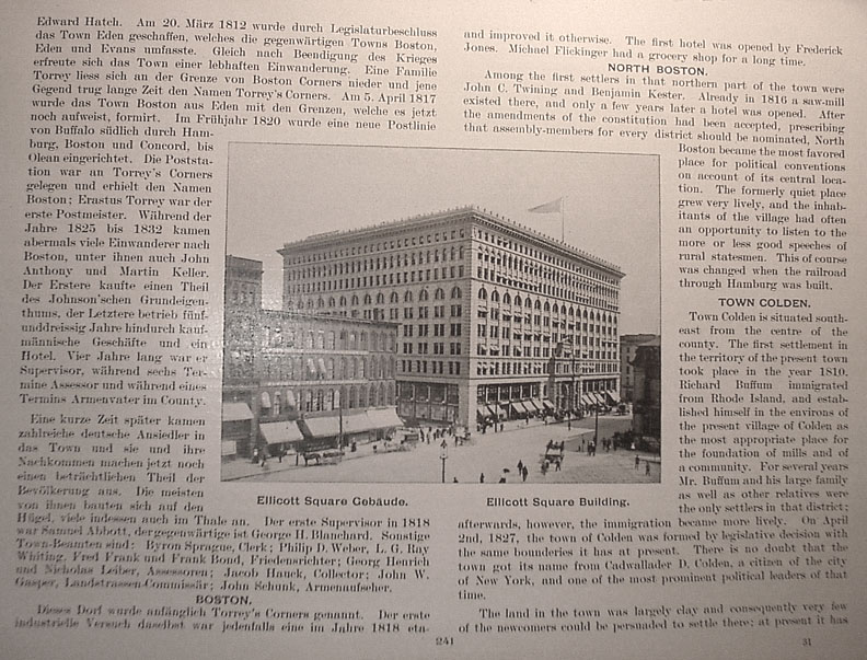 and improved it otherwise. the first hotel was opened by Frederick Jones. Michael Flickinger had a grocery shop for a long time. North Boston Among the first settlers in that northern part of the town were John C. Twining and Benjamin Kester. Already in 1816 a saw-mill existed there, and only a few years later a hotel was opened. After the amendments of the constitution had been accepted, prescribing that assembly-members for every district should be nominated, North Boston became the most favored place for political conventions on account of its central location. The formerly quiet place grew very lively, and the inhabitants of the village had often the opportunity to listen to the more or less good speeches of rural statesmen. This of course was changed when the railraod through Hamburg was built. Town Colden Town Colden is situated south-east from the centre of the county. The first settlement in the territory of the present town took place in the year 1810. Richard Buffum immigrated from Rhode Island, and established himself in the environs of the present village of Colden as the most appropriate place for the foundation of mills and of a community. For several years Mr. Buffum and his large family as well as other relatives were the only settlers in that district; afterwards, however, the immigration became more lively. On April 2nd, 1827, the town of Colden was formed by legislative decision with the same boundries it has at present. There is no doubt that the town got its name from Cadwallader D. Colden, a citizen of the city of New York, and one of the most prominent political leaders of that time. The land in the town was largely clay and consequently very few of the newcomers could be persuaded to settle there; at present it has Caption under picture at center reads Ellicott Square Building Return to Indexes Go on to Pages 242 - 246