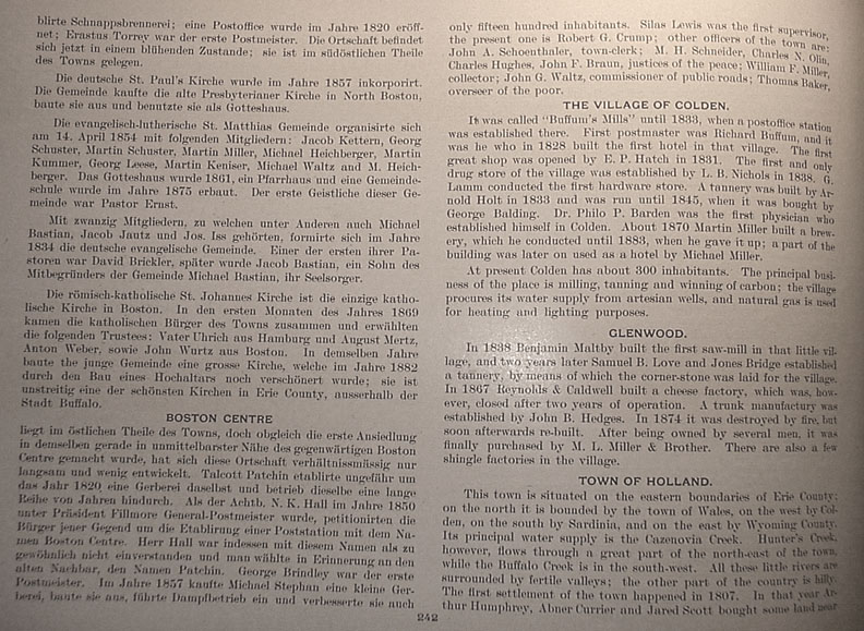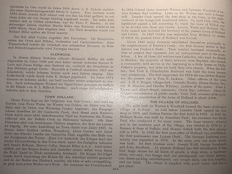 . | In 1814 Colonel (later General) Warren and Ephraim Woodruff of Aurora finished that building. Later on Mr. Warren also built a forage-mill. Leander Cook opened the first shop in the town, in the neighborhood of the forage-mill mentioned before. On April 15th, 1814, the legislature passed a bill, according to which the town of Willink was to be divided into three new towns: Aurora, Wales and Holland. The town named last included the territory of the present towns of Holland and Colden. In 1827 Colden was separated from Holland, by means of which the present town of Holland was formed. About 1840 many Germans established themselves principally in the neighborhood of Hunter's Creek; the first German settler in that district was Frederick Riefer. Their number increased constantly, so that at present they represent not an unimportant part of the population. A few of these old settlers were Catholics, who went to church in Sheldon; the majority of them, however, were Baptists, who formed a community, held services in the beginning in a little house on Philip Fisher's property, but later on built their own church. When the Buffalo, New York & Philadelphia Railroad was built the town became very prosperous. The first supervisor for 1819-20 was Arthur Humphrey, the present one is Tom B. Jackson. [1] Other officers of the town are: J.M.C. Borger, village clerk; Orlando Hawks, Hiram Brown, Beverley M. Stanton and Charles Whitney, justices of the peace; Peter J. Komer and Albert Sergel, assessors; Orwin Day, collector; Albert H. Griggs, commissioner of public roads; Fred. Taff, overseer of the poor. The present population of the town of Holland is about 2000. The Village of Holland The mills built by Warren & Woodruff formed the basis of the later village of Holland. As told before Leander Cook opened the first shop in 1816, and Joshua Barron the first hotel in 1816. In 1835 the Holland House was built by Jonathan Paul; his successor was David Paul, who conducted it for many years. The large tannery, situated now in the southern part of the village, was started in 1850 by A. Rumsey & Sons of Buffalo, and Horace Selleck built the first planing mill in 1876. In 1822 the first post-office of Holland was established; the first postmaster was Lyman Clark. The German Lutheran community was organized in 1874. In the same year one more church was built. Its trustees were: Joseph Wolff, George Leonhardt and John Brodbeck. At present Holland has 600 inhabitants, it has four large stores for all kinds of goods, a drug store, a hardware store, two saw, two forage and one planing mill, one trunk factory, one cheese-packing establishment [2], one cooper shop, one iron foundry, and one bank. The village is supplied with good water, and has a gas plant. [3] [1] The German text gives the name as "Wm. B. Jackson". Return to text [2] The German text states that the Village of Holland has "two cheese-packing plants". Return to text [3]The German text states "The village has a good water supply and has gas lighting." Return to text