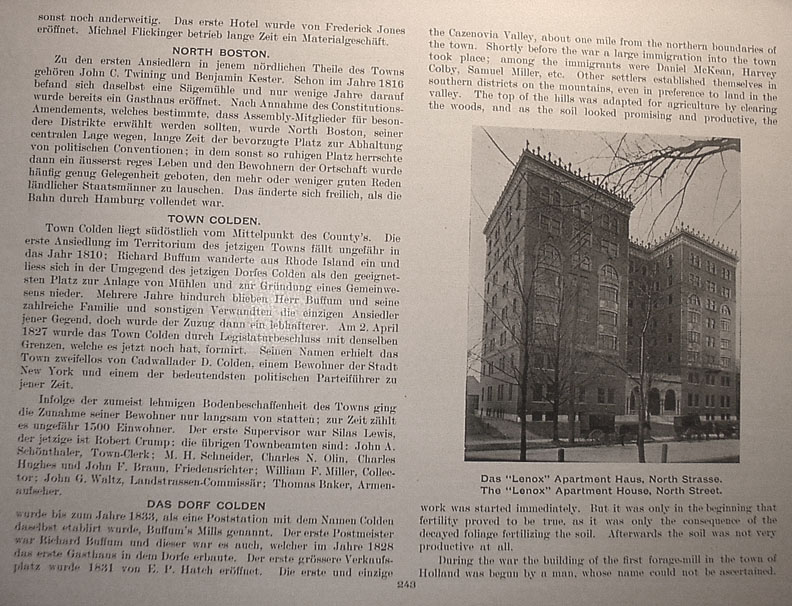 . | the Cazenovia Valley, about one mile from the northern boundries of the town. Shortly before the war a large immigation into the town took place; among the immigrants were Daniel McKean, Harvey Colby, Samuel Miller, etc. Other settlers established themselves in southern districts on the mountains, even in preference to land in the valley. The top of the hills was adapted for agriculture by clearing the woods, and as the soil looked promising and productive, the work was started immediately. But it was only in the beginning that fertility proved to be true, as it was only the consequence of the decayed foliage fertilizing the soil. Afterwards the soil was not very productive at all. During the war the building of the first forage-mill in the town of Holland was begun by a man, whose name could not be ascertained. Caption under picture at right center reads The "Lenox" Apartment House, North Street |
