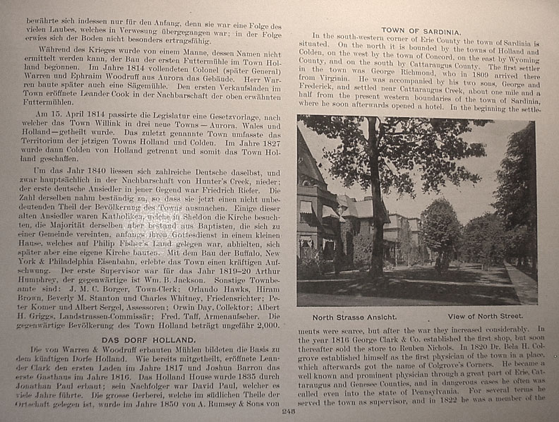 . | Town of Sardinia In the south-western corner of Erie County the town of Sardinia is situated. On the north it is bounded by the towns of Holland and Colden, on the west by the town of Concord, on the east by Wyoming County, and on the south by Cattaraugus County. The first settler in the town was George Richmond, who in 1809 arrived there from Virginia. He was accompanied by his two sons, George and Frederick, and settled near Cattaraugus Creek, about one mile and a half from the present western boundries of the town of Sardinia, where he soon afterwards opened a hotel. In the beginning the settlements were scarce, but after the war they increased considerably. In the year 1816 George Clark & Co. established the first shop, but soon thereafter sold the store to Reuben Nichols. In 1820 Dr. Bela H. Colgrove established himself as the first physician of the town in a place, which afterwards got the name of Colgrove's Corners.[1] He became a well known and prominent physician through a great part of Erie, Cattaraugus and Genesee Counties, and in dangerous cases he often was called even into the state of Pennsylvania. For several terms he served the town as supervisor, and in 1822 he was a member of the Caption under picture at right center reads View of North Street [1] The German text spells the name "Colegrove". Return to text