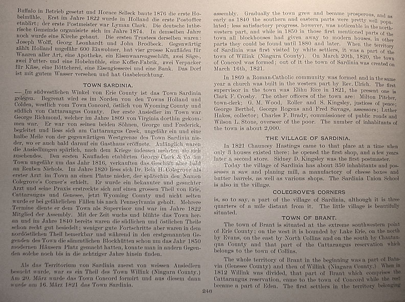 assembly. Gradually the town grew and became prosperous, and as early as 1840 the southern and eastern parts were pretty well populated; less satisfactory progress, however, was noticeable in the north-western part, and while in 1850 in those first mentioned parts of the town all the blockhouses had given away to modern houses, in other parts they could be found until 1880 and later. When the territory of Sardinia was first visited by white settlers, it was a part of the town of Willink (Niagara County). On March 20th, 1820, the town of Concord was formed; out of it the town of Sardinia was created on March 16th, 1821. In 1869 a Roman-Catholic community was formed and in the same year a church was built in the western part by Rev. Ulrich. The first supervisor in the town was Elihu Rice in 1821, the present one is Clark F. Crosby. The other officers of the town are: Milton Pitcher, town-clerk; G.M. Wood, Roller and S. Kingsley, justices of peace; George Berthel [1], George Rogens [2] and Fred Savage, assessors; Luther Hakes, collector; Charles F. Brady, commissioner of public roads and Wilson L. Stone, overseer of the poor. The number of inhabitants of the town is about 2000. The Village of Sardinia In 1821 Chauncey Hastings came to that place at a time when only 3 houses existed there; he opened the first shop, and a few years later a second store. Sidney D. Kingsley was the first postmaster. Today the village of Sardinia has about 350 inhabitants and possesses a saw and planing mill, a manufactury of cheese boxes and butter barrels, as well as various shops. The Sardinia Union School is also in the village. Colgrove's Corners is, so to say, a part of the village of Sardinia, although it is three quarters of a mile distant from it. The little village is beautifully situated. Town of Brant The town of Brant is situated at the extreme southwestern point of Erie County; on the west is it bounded by Lake Erie, on the north by Evans, on the east by North Collins and on the south by Chautauqua County and that part of the Cattaraugus reservation which belongs to the town of Collins. The whole territory in the beginning was part of Batavia (Genesee County) and then Willink (Niagara County.) When in 1812 Willink was divided, that part of Brant which comprises the Cattaraugus reservation, came to the town of Concord while the rest became a part of Eden. The first settlers in the territory belonging [1] The German text gives the name as "Barthel". Return to text [2]The German text gives the name as "Rogers". Return to text Return to Indexes Go on to Pages 247 - 251