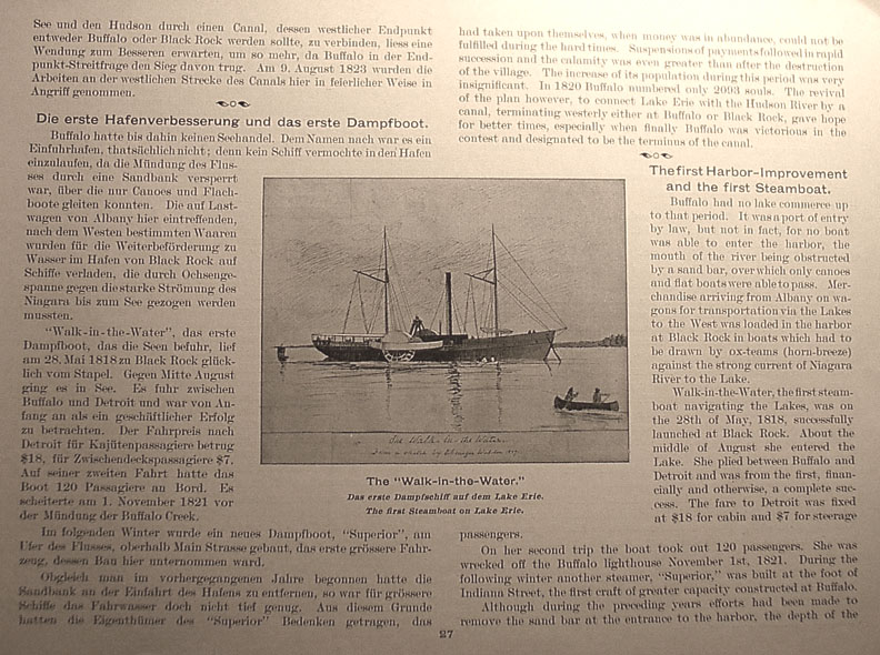 . | had taken upon themselves, when money was in abundance, could not be fulfilled during the hard times. Suspensions of payments followed in rapid succession and the calamity was even greater than after the destruction of the village. The increase in its population during this period was very insignificant. In 1820 Buffalo numbered only 2093 souls. The revival of the plan however, to connect Lake Erie with the Hudson River by a canal, terminating westerly either at Buffalo or Black Rock, gave hope for better times, especially when finally Buffalo was victorious in the contest and designated to be the terminus of the canal. The first Harbor-Improvement and the first Steamboat Buffalo had no lake commerce up to that period. It was a port of entry by law, but not in fact, for no boat was able to enter the harbor, the mouth of the river being obstructed by a sand bar, over which only canoes and flat boats were able to pass. Merchandise arriving from Albany on wagons for transportation via the Lakes to the West was loaded in the harbor at Black Rock in boats which had to be drawn by ox-teams (horn-breeze) against the strong current of Niagara River to the Lake. Walk-in-the-Water, the first steamboat navigating the Lakes, was on the 28th of May, 1818, successfully launched at Black Rock. About the middle of August she entered the Lake. She plied between Buffalo and Detroit and was from the first, financially and otherwise, a complete success. The fare to Detroit was fixed at $18 for cabin and $7 for steerage passengers. On her second trip the boat took out 120 passengers, She was wrecked off the Buffalo lighthouse November 1, 1821. During the following winter another steamer, "Superior", was built at the foot of Indiana Street, the first craft of greater capacity constructed at Buffalo. Although during the preceding years efforts had been made to remove the sand bar at the entrance of the harbor, the depth of the Caption under picture at center reads The "Walk-in-the-Water", the first Steamboat on Lake Erie
