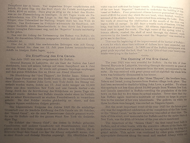 . | water was not sufficient for larger vessels. For this reason the projectors of the new boat "Superior" hesitated to undertake the building of this vessel at Buffalo. Four prominent citizens however guaranteed the payment of $100 for every day which the new boat, when finished, would on account of the shallow bank, be prevented from entering the Lake. Then the work of removing the obstruction at the mouth of the river was begun with all energy. In 221 days a trestle work of fascines, 170 feet long, was built out into the Lake. All citizens, regardless of position, took part to speed the work. The high water of the spring, aided by human efforts, washed the shelf of sand through the channel, made narrower by the trestle of fascines, - and the "Superior" was enabled to go to sea in due time. This was the beginning of the improvement of the harbor of Buffalo - a work for which since then millions of dollars have been expended, and which is not yet completed. In 1823 one of the Buffalo newspapers with great ptide reported the fact, that "on July 12th of that year twenty-nine boats were lying in the harbor." The Opening of the Erie Canal The year 1825 was very eventful for Buffalo. On the 4th of June General Marquis de Lafayette, traveling through the country as guest of the Nation, arrived here on a steamer from the west, accompanied by his suite. He was received with great pomp and at nightfall the whole little town was brilliantly illuminated in his honor. June 17th the execution of the "three Thayers", the brothers Isaac, Nelson and Israel, young farmers from Boston village took place. They had been sentenced to death for killing John Love, a peddler. To witness this spectacle not less than about 10,000 people from Western New York and Canada assembled in Buffalo - swelling the population of the little town on this day to five times its actual number. Never since that day has Buffalo again received a multitude of visitors so large in proportion to the number of her own inhabitants. The gallows, on which the three brothers were hanged, was erected on Niagara Square. [1.] But the most important event of the year 1825 for the future great city was the magnificent celebration of the completion of the Erie Canal, or the "Grand Canal", as the new waterway was called at that time. The date of this event, ever memorable for Buffalo and for the entire State of New York, was the 26th of October of the year above mentioned. The departure of the "Seneca Chief", the first canal boat built in Buffalo, and of other boats, with the executive officers of the State, delegations, committees and guests on board, was signaled by the firing of a grand salute. This salute was continued by other guns, stationed at appropriate distances along the canal and reached Albany within one [1.] Page 28, paragraph 6, left column - Translator's note - The German text for this sentence reads "The three brothers were hanged at the same time at the gallows constructed on Niagara Square." Return to text |