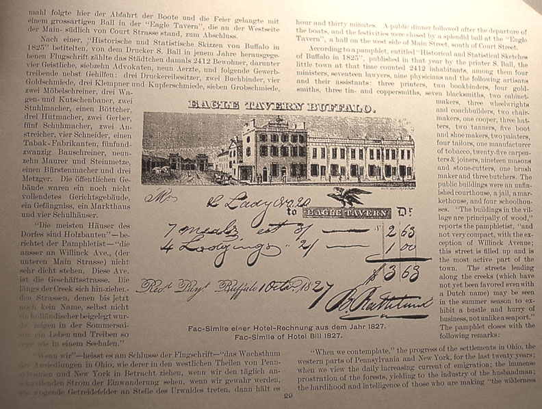 . | hour and thirty minutes. A public dinner followed after the departure of the boats, and the festivities were closed by a splendid ball at the "Eagle Tavern", a hall on the west side of Main Street, south of Court Street. According to a pamphlet, entitled "Historical and Statistical Sketches of Buffalo in 1825", published in that year by the printer S. Ball, the little town at that time counted 2412 inhabitants, among them four ministers, seventeen lawyers, nine physicians and the following artisans and their assistants: three printers, two bookbinders, four goldsmiths, three tin- and coppersmiths, seven blacksmiths, two cabinetmakers, three wheelwrights and coachbuilders, two chairmakers, one cooper, three hatters, two tanners, five boot and shoemakers, two painters, four tailors, one manufacturer of tobacco, twenty-five carpenters and joiners, nineteen masons and stone-cutters, one brush maker and three butchers. The public buildings were an unfinished courthouse, a jail, a markethouse, and four schoolhouses. "The buildings in the village are principally of wood," reports the pamphetist, "and not very compact, with the exception of Willinck Avenue [1.]; this street is filled up and is the most active part of the town. The streets leading along the creeks (which have not yet been favored even with a Dutch name) may be seen in the summer season to exhibit a bustle and hurry of business, not unlike a seaport." The pamphlet closes with the following remarks: "When we contemplate the progress of the settlements in Ohio, the western parts of Pennsylvania and New York, for the last twenty years; when we view the daily increasing current of emigration; the immense prostration of the forests, yielding to the industry of the husbandman; the hardihood and intelligence of those who are making 'the wilderness Caption under picture at center reads Fac-Simile of Hotel Bill 1827 [1.]Page 29, paragraph 3, left column - Translator's Note: In the German text after Willinck Avenue it reads in parentheses "lower Main Street." Return to text