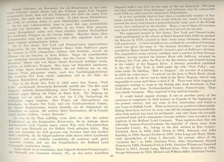 It was very probable that at that time a considerable number of Germans, having landed in the new world without any means of support, entered the army and formed a proportionately large part of the British forces, then stationed at the frontier. Many a one of these old warriors may have settled in this region, after he had served out his time. The regiments formed in New Jersey, New York and Pennsylvania, which participated in the attack of Major General John Sullivan against the Senecas in 1779, counted in their ranks many Germans, officers as well as privates. A whole battallion even, exclusively recruited of Germans, which was given the name of "the German Batallion", and was commanded by Major Daniel Burkhardt, formed a part of Sullivan's division. The supposition seems entirely justified, that a number of these German soldiers, having reached the Genesee River with Sullivan, returned to Western New York after the War of the Revolution and founded homes in the vicinity of the Niagara River. A literary periodical published in the city of New York in 1810 under the title "Port Folio", contains under the heading, "Ride to Niagara", the account of a journey, in which the writer says: "I arrived (at the ferry in Black Rock) about twelve o'clock M [1.]; the ice was so thick in the River Niagara, that it was impossible to cross until three o'clock P.M. There were three wagons of emigrants waiting to cross on the British side, from Schoharie, in New York State, and from Northumberland County, Pennsylvania. They were chiefly Germans. They expected to buy land in Canada." It would indeed appear strange, if one or another party of the caravans of emigrants on their journey to Canada at the beginning of the present century, had not come to New Amsterdam and found a new home at Buffalo Creek. There is, however, no positive evidence establishing these facts, for not in every case did the immigrants immediately after their arrival buy land for settlement; and only those who actually purchased land and in consequence became settlers, were recorded in the registers of the Holland Land Company. These registers show that the following German-Pennsylvanians, the majority of whom came from Lancaster County, Pa., belong to the first settlers in Erie County: Frederick Buch [2.] in 1802, John Peters in 1804, Solomon and John Sparling in 1805, Samuel Fackler in 1807, John Long and Henry Rheinwald (grandfather of Adam L. Rinewalt, the present editor of the "Amherst Bee") in 1808, Christian Wutz, John Eschelmann, Samuel Fleischer in 1809, Christian Frick in 1810, Abraham Witmer and Emanuel Winter in 1811, Joseph Long, Michael Gries, Peter Herschey in 1812, George Schumann in 1813, Michael and William Miller, Christian Vinecke,