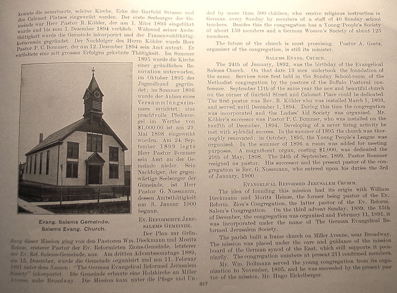 . | by more than 500 children, who receive religious instruction in German every Sunday by members of a staff of 40 Sunday school teachers. Besides this the congregation has a Young People's Society of about 150 members and a German Women's Society of about 125 members. The future of the church is most promising. Pastor A. Goetz, organizer of the congregation, is still its minister. Salems Evang. Church The 24th of January, 1892, was the birthday of the Evangelical Salems Church. On that date 13 men undertook the foundation of the same. Services were first held in the Sunday School-room of the Methodist congregation by the pastors of the Buffalo Pastoral conference. September 11th of the same year the new and beautiful church on the corner of Garfield Street and Calumet Place could be dedicated. The first pastor was Rev. R. Köhler who was installed March 1, 1893, and served until December 1, 1894. During this time the congregation was incorporated and the Ladies' Aid Society was organized. Mr. Köhler's successor was Pastor P.C. Bommer, who was installed on the twelfth of December, 1894. Developing of a never tiring activity he met with splendid success. In the summer of 1895 the church was throughly renovated; in October, 1895, the Young People's League was organized. In the summer of 1896 a room was added for meeting purposes. A magnificent organ, costing $1,000, was dedicated the 29th of May, 1898. The 24th of September, 1899, Pastor Bommer resigned as pastor. His successor and the present pastor of the congregation is Rev. G. Nussmann, who entered upon his duties the 3rd of January, 1900. Evangelical Reformed Jerusalem Church The idea of founding this mission had its origin with William Dieckmann and Moritz Heinze, the former being pastor of the Ev. Reform Zion's Congregation, the latter pastor of the Ev. Reform Salem's Congregation. On the third advent Sunday, 1889, the 15th of December, the congregation was organized and February 11, 1891, it was incorporated under the name of The German Evangelical Reformed Jerusalem Society. The parish built a frame church on Miller Avenue, near Broadway. The mission was placed under the care and guidance of the mission board of the German synod of the East, which still supports it pecuniarily. This congregation numbers at present 211 confirmed members. Mr. Wm. Bollmann served the young congregation from its organization to November, 1895, and he was succeeded by the present pastor of the mission, Mr. Hugo Eickelberger. Caption under picture at left center reads Salems Evang. Church