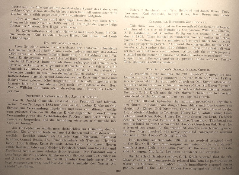 . | Elders of the church are: Wm. Helbrand and Jacob Denne; Trustees are: Karl Schwedel [1], George Hines, Karl Braun and Louis Schreibdinger. Evangelical Reformed Zoar Society This church was organized as the seventh of the German Reformed churches of the city of Buffalo by the pastors William Bollmann, A.E. Dahlmann and Valentine Rettig on the second advent Sunday of 1895. When founded it numbered twenty families, and chose pastor A. Bollman for its minister and enjoyed under his direction a most prosperous growth. At present the congregation numbers 170 members, the Sunday school 140 children. During the first half year services were held in a vacant store. Afterwards the church property situated on the corner of Genesee and Rohr Streets was purchased for a chapel. In it the congregation at present holds services. Pastor Wm. Bollman is still its minister. The St. Jacob's German Evang. Church As recorded in the minutes, the "St. Jacob's" Congregation was founded in the following manner: "On the 24th of August 1883 a meeting was held in the St. Jacob's Church on Oak Street, attended by a number of men who were chiefly members of the "St. Marcus" church. The object of this meeting was to discuss the relations existing between the Rev. O.H. Kraft and the "St. Marcus" church and to take into consideration the founding of a new evangelical church. On the 10th of September they actually proceeded to organize a new church. A board, consisting of four elders and four trustees was elected. As Elders: Carl Dittmann, Ferdinand Gruhlke, Conrad Swain, Jr., Frederick Schultz; as Trustees: Henry Dedo, Adolf Kelling, Ernst Schmidt and John Dedo. Henry Dedo was chosen President, Frederick Schultz, Secretary and Ferdinand Gruhlke, Treasurer. This board was commissioned to rent the vacant St. Jacob's Church on Oak Street for a term of two years. As the original St. Jacob's church existing under the Rev. Vogt dissolved, the newly organized congregation assumed the name: "St. Jacob's" Evang. Church. In a meeting held September 19th, it was resolved to extend a call to the Rev. O.H. Kraft, who resigned as pastor of the "St. Marcus" church August 10th of the same year. At the same time it was decided to engage Mr. L.W. Lehmann as teacher and organist. On the 7th of October the Rev. O.H. Kraft reported that the "St. Marcus" church had unexpectedly released him from his pastoral duties whereupon the new "St. Jacob's" church immediately engaged him as pastor. And on the 14th of October the congregation united to hold [1]The German text gives the name as "Karl Schödel." Return to text |
