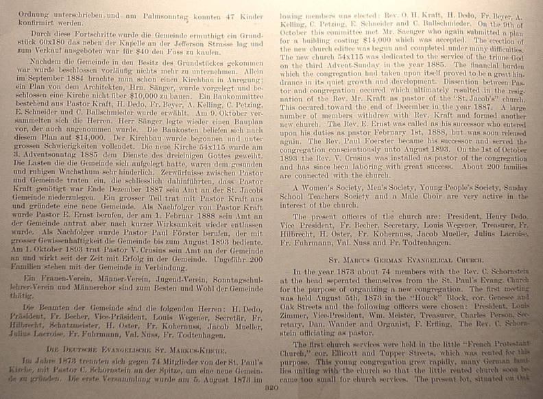 . | members was elected: Rev. O.H. Kraft, H. Dedo. Fr. Beyer, A. Kelling, C. Petzing, E. Schneider and C. Ballschmieder. On the 9th of October this committee met Mr. Saenger who again submitted a plan for a building costing $14,000 which was accepted. The erection of the new church edifice was begun and completed under many difficulties. The new church 54 x 115 was dedicated to the service of the triune God on the third Advent-Sunday in the year 1885. The financial burden which the congregation had taken upon itself proved to be a great hindrance in its quiet growth and development. Dissention between Pastor and congregation occured which ultimately resulted in the resignation of the Rev. Mr. Kraft as pastor of the "St. Jacob's" church. This occured toward the end of December in the year 1887. A large number of members withdrew with Rev. Kraft and formed another new church. The Rev. E. Ernst was called as his successor who entered upon his duties as pastor February 1st, 1888, but was soon released again. The Rev. Paul Foerster became his successor and served the congregation conscientiously unto August 1893. On the 1st of October 1893 the Rev. V. Crusius was installed as pastor of the congregation and has since been laboring with great success. About 200 families are connected with the church. A Women's Society, Men's Society, Young People's Society, Sunday School Teachers Society and a Male Choir are very active in the interest of the church. The present officers of the church are: President, Henry Dedo, Vice-President, Fr. Becher, Secretary Louis Wegener, Treasurer, Fr. Hilbrecht, H. Oster, Fr. Kohernuss, Jacob Mueller, Julius Lacroise, Fr. Fuhrmann, Val. Nuss and Fr. Todtenhagen. St. Marcus German Evangelical Church In the year 1873 about 74 members with the Rev. C. Schornstein at the head seperated [sic] themselves from the St. Paul's Evang. Church for the purpose of organizing a new congregation. The first meeting was held August 5th, 1873 in the "Houck" Block, cor. Genesee and Oak Streets and the following officers were chosen: President, Louis Zimmer, Vice-President, Wm. Meister, Treasurer, Charles Person, Secretary, Dan. Wander and Organist, F. Erfling. The Rev. C. Schornstein officiating as pastor. The first church services were held in the little "French Protestant Church," cor. Ellicott and Tupper Streets, which was rented for this purpose. The young congregation grew rapidly, many German families uniting with this church so that the little rented church soon became too small for church services. The present lot, situated on Oak