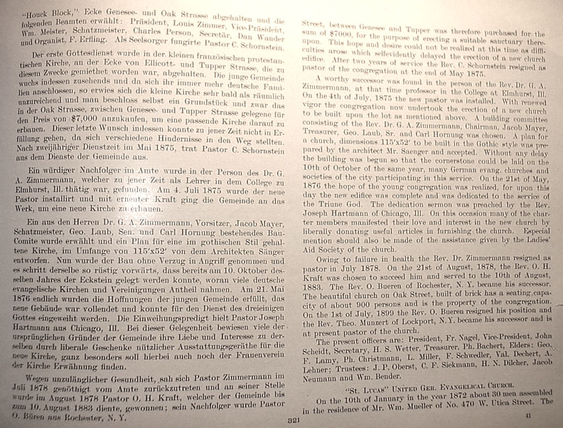 Street, between Genesee and Tupper was therefore purchased for the sum of $7000, for the purpose of erecting a suitable sanctuary thereupon. This hope and desire could not be realized at this time as difficulties arose which selfevidently delayed the erection of a new church edifice. After two years of service the Rev. C. Schornstein resigned as pastor of the congregation at the end of May 1875. A worthy successor was found in the person of the Rev. Dr. G.A. Zimmermann, at that time professor in the College at Elmhurst, Ill. On the 4th of July, 1875 the new pastor was installed. With renewed vigor the congregation now undertook the erection of a new church to be built upon the lot as mentioned above. A building committee consisting of the Rev. Dr. G.A. Zimmermann, Chairman, Jacob Mayer, Treasurer, Geo. Laub, Sr. and Carl Hornung was chosen. A plan for a church, dimensions 115' X 52' to be built in the Gothic style was prepared by the architect Mr. Saenger and accepted. Without any delay the building was begun so that the cornerstone could be laid on the 10th of October of the same year, many German evang. churches and societies of the city participating in this service. On the 21st of May, 1876 the hope of the young congregation was realized, for upon this day the new edifice was complete and was dedicated to the service of the Triune God. The dedication sermon was preached by the Rev. Joseph Hartmann of Chicago, Ill. On this occasion many of the charter members manifested their love and interest in the new church by liberally donating useful articles in furnishing the church. Especial mention should also be made of the assistance given by the Ladies' Aid Society of the church. Owing to failure in health the Rev. Dr. Zimmermann resigned as pastor in July 1878. On the 21st of August, 1878, the Rev. O.H. Kraft was chosen to succeed him and served to the 10th of August, 1883. The Rev. O. Bueren of Rochester, N.Y. became his successor. The beautiful church on Oak Street, built of brick has a seating capacity of about 900 persons and is the property of the congregation [1]. On the 1st of July, 1899 the Rev. O. Bueren resigned his position and the Rev. Theo. Munzert of Lockport, N.Y. became his successor and is at present pastor of the church. The present officers are: President, Fr. Nagel, Vice-President, John Scheidt, Secretary, H.S. Wetter, Treasurer, Ph. Bachert, Elders: Geo. F. Lamy, Ph. Christmann, L. Miller, F. Schwedler, Val. Dechert, A. Lehner; Trustees: J.P. Oberst, C.F. Siekmann [2], H.N. Dilcher, Jacob Neumann and Wm. Bender. "St. Lucas" United Ger. Evangelical Church On the 10th of January in the year 1872 about 30 men assembled in the residence of Mr. Wm Mueller of No. 470 W. Utica Street. The [1]The German text states "the property is fully the property of the congregation" which means that there is no debt on the church. Return to text [2]The German text does not list this name. Instead it lists "C.F. Hartmann" among the trustees. Return to text Return to Indexes Go on to Pages 322 - 326