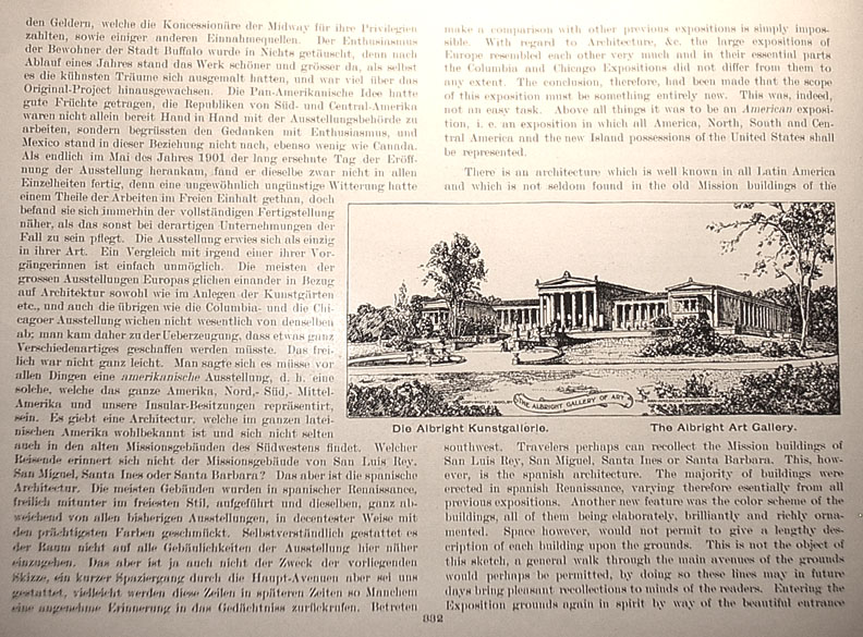 | . | make a comparison with other expositions is simply impossible. With regard to Architecture, &c. the large expositions of Europe resembled each other very much and in their essential parts the Columbia and Chicago Expositions did not differ from them to any extent. The conclusion, therefore, had been made that the scope of this exposition must be something entirely new. This was, indeed, not an easy task. Above all things it was to be an American exposition, i.e. an exposition in which all America, North, South, and Central America and the new Island possessions of the United States shall be represented. There is an architecture which is well known in all Latin America and which is not seldom found in the old Mission buildings of the southwest. Travelers perhaps can recollect the Mission buildings of San Luis Rey, San Miguel, Santa Ines or Santa Barbara. This, however, is the spanish architecture. The majority of buildings were erected in spanish Renaissance, varying therefore essentially from all previous expositions. Another feature was the color scheme of the buildings, all of them, being elaborately, brilliantly and richly ornamented. Space, however, would not permit to give a lengthy description of each building upon the grounds. This is not the object of this sketch, a general walk through the main avenues of the grounds would perhaps be permitted, by doing so these lines may in future days bring pleasant recollections to minds of the readers. Entering the Exposition grounds again in spirit by way of the beautiful entrance Caption under picture at center reads The Albright Art Gallery