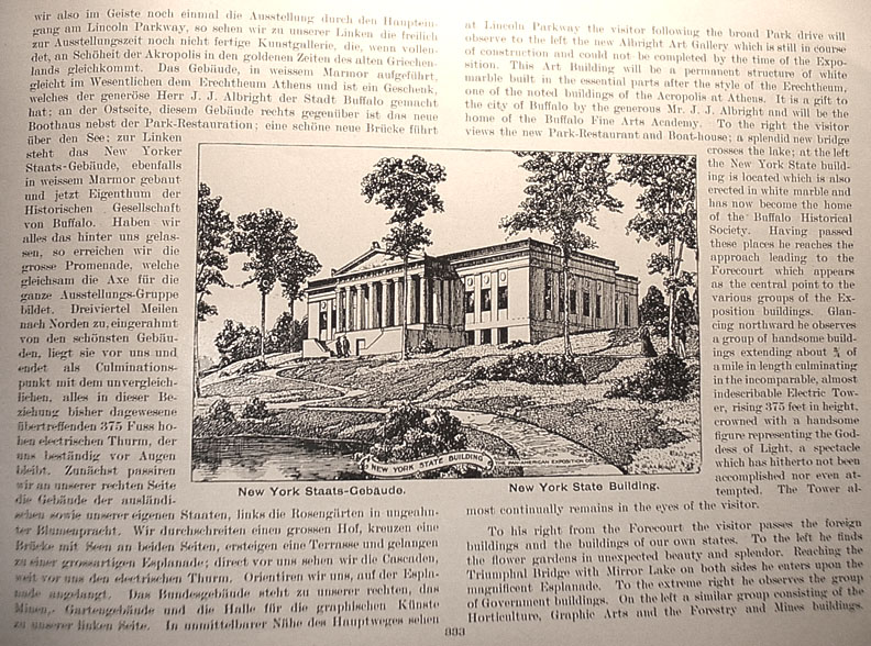 | . | at Lincoln Parkway the visitor following the broad Park drive will observe to the left the new Albright Art Gallery which is still in course of construction and could not be completed by the time of the Exposition. This Art Building will be a permanent structure of white marble built in the essential parts after the style of the Erectheum, one of the noted buildings of the Acropolis at Athens. It is a gift to the city of Buffalo by the generous Mr. J.J. Albright and will be the home of the Buffalo Fine Arts Academy. To the right the visitor views the new Park-Restaurant and Boat-House; a splendid new bridge crosses the lake; at the left the New York State building is located which is also erected in white marble and has now become the home of the Buffalo Historical Society. Having passed these places he reaches the approach leading to the Forecourt which appears as the central point to the various groups of the Exposition buildings. Glancing northward he observes a group of handsome buildings extending about ¾ of a mile in length culminating in the incomparable, almost indescribable Electric Tower, rising 375 feet in height, crowned with a handsome figure representing the Goddess of Light, a spectacle which has hitherto not been accomplished nor even attempted. The Tower almost continually remains in the eyes of the visitor. To his right from the Forecourt the visitor passes the foreign buildings and the building of our own states. To the left he finds the flower gardens in unexpected beauty and splendor. Reaching the Triumphal Bridge with Mirror Lake on both sides he enters upon the magnificent Esplanade. To the extreme right he observes the group of Government buildings. On the left a similar group consisting of the Horticulture, Graphic Arts and the Forestry and Mines building.[1] Caption under picture at center reads New York State Building [1]The German text states: "Next on our right-hand side we pass by the foreign buildings as well as those of our states while to the left there's a rose garden in full bloom. We cut through a large courtyard, cross a bridge with a lake on both sides, climb a terrace and reach a magnificent Esplanade; directly in front of us we see the cascading fountains and in the distance we see the Electric Tower. The Government Building stands to our right, and Mining and Horticulture Buildings and the Hall for Graphic Arts to our left." Return to text |