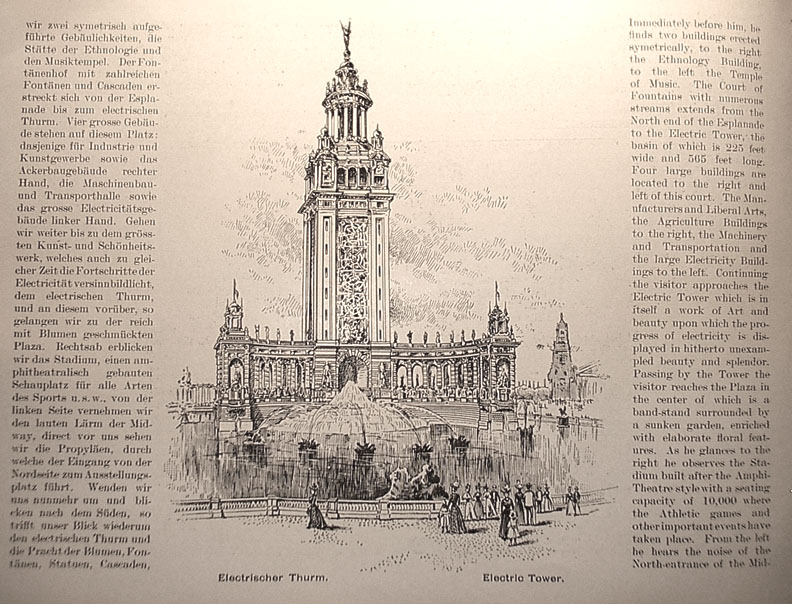 | . | Immediately before him, he finds two building erected symetrically, to the right the Ethnology Building, to the left the Temple of Music. The Court of Fountains with numerous streams extends from the North end of the Espanade to the Electric Tower, the basin of which is 225 feet wide and 565 feet long. Four large buildings are located to the right and left of this court. The Manufacturers and Liberal Arts, the Agriculture Buildings to the right, the Machinery and Transportation and the large Electricity Buildings to the left. Continuing the visitor approaches the Electric Tower which is in itself a work of Art and beauty upon which the progress of electricity is displayed in hitherto unexampled beauty and splendor. Passing by the Tower the visitor reaches the Plaza in the center of which is a band-stand surrounded by a sunken garden, enriched with elaborate floral features. As he glances to the right he observes the Stadium built after the Amphitheatre style with a seating capacity of 10,000 where the Athletic games and other important events have taken place. From the left he hears the noise of the North-entrance of the Midway. Caption under picture at center reads Electric Tower