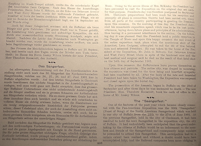 Music. Owing to the severe illness of Mrs. McKinley the President had been prevented to visit the Exposition on the original day set aside for that purpose. Presidents-days was therefore postponed to September 5th. Elaborate preparations had been made for his reception and promptly all plans in connection thereto had been carried out, many from all parts of the country participating in greeting the President upon this occasion. On the morning of this day the President delivered his remarkable exposition speech which was to be his last public utterance, laying down future plans and principles for his administration, thus leaving it a permanent inheritance to the nation. On the following day it was planned that the President hold a public reception in the Temple of Music and upon thus happy occasion the sad event of the entire exposition took place when the murderous shot of the Anarchist, Leon Czolgosz, attempted to end the life of this beloved man and esteemed President. He was taken to the home of the President of the Exposition, Mr. John G. Milburn, Cor. Delaware Avenue and West Ferry Street, where in spite of the tenderest care and the best medical and surgical skill he died as the result of that fatal shot on the 14th day of September 1901. Upon this occasion the Buffalonians have proven themselves as true citizens and patriots. The entire city was draped in mourning, the exposition was closed for the time being and heartfelt sympathy had been manifested by all. After the body of the late and lamented President had been taken to Washington, the Exposition was reopened and closed again upon the burial day. The prosecution of the Assassin began in Buffalo on the 23rd of September and after three days he was sentence to death. - The new President, Hon. Theodore Roosevelt, took his oath of office in the home of Mr. Ansley Wilcox. The "Saengerfest" One of the features of the past year which became closely connected witht the Pan-American Exposition was the 30th "Saengerfest" (Feast of Song) of the North American Saengerbund which was held in our city of Buffalo from the 24th to the 27th of June 1901. At the previous Saengerfest, held in the city of Cincinnati, it had been resolved to hold the next Saengerfest in the exposition city, the city of Buffalo. It had undoubtedly been anticipated that the great undertaking by the citizens of Buffalo would be an inducement to the members and friends of the Seangerbund and consequently large numbers be persuaded to attend the Saengerfest. This anticipation had to a certain extent been realized and without a doubt would have been accomplished fully, had the Railroad companies been more obliging in Return to Indexes Go on to Pages 337 - 338