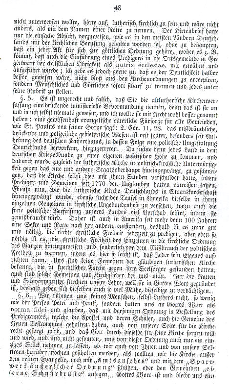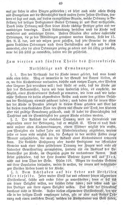 § 3. No. 3 is from Luther's text "Ways to hold Christian Mass." Here Luther states: It may not be fitting to encumber Christian conscience with laws and commands. The text arranges nothing conclusive concerning these things; it permits the freedom of the spirit to ascertain its meaning according to time, place and people. With texts and examples of the fathers one need not prove this ordering (to hold mass), for there are things not known and what is known or somewhat known is not sufficient to draw conclusions and we certainly do not know whether these things were of one sort or another, whether they were applied through law or necessity, and whether we should follow these examples. § 4. Luther wishes it known that the church orders, as good as they might be, should be quickly abolished if through misuse there results a disadvantage to faith and love. All this also finds no application in the pastoral letter;
