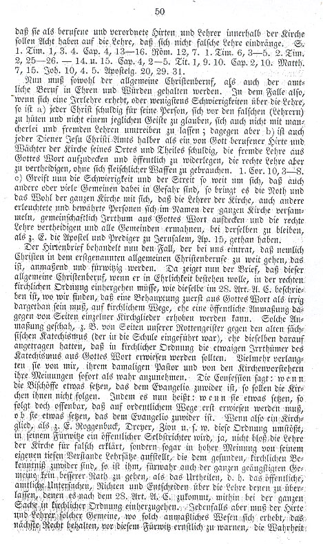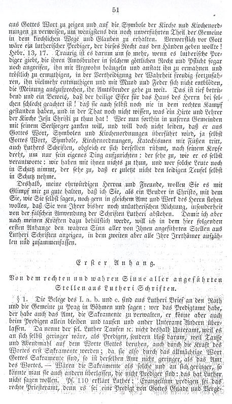 § 5. No. 5 is taken from Luther's interpretation of the 8th Psalm. Here Luther states: it is God's calling when a call to ministerial office is sent out and received, which runs beyond, and indeed contrary to, one's will, and is then confirmed by the authority of the superiors, be they spiritual or worldly. People should not despise someone who seeks the office out of godly and good intentions, 1 Timothy 3, 1. Here Luther does not discuss the order of the installation into office but the life conduct leading to it; and above all else one can also find an indication of God's will when a person, without announcing himself, is drawn to the office. If one were to consider such a person merely as being God's chosen, then one could not consider it being called by God, for a person to proclaim the office for himself and thereafter be properly ordained. Comment - In the words of Luther I used at the close of the first part of the pastoral letter, Luther discusses above all else the means of the calling, which the apostles and disciples had themselves maintained, and said that it must remain so. This is a) proper election by the congregation, b) |