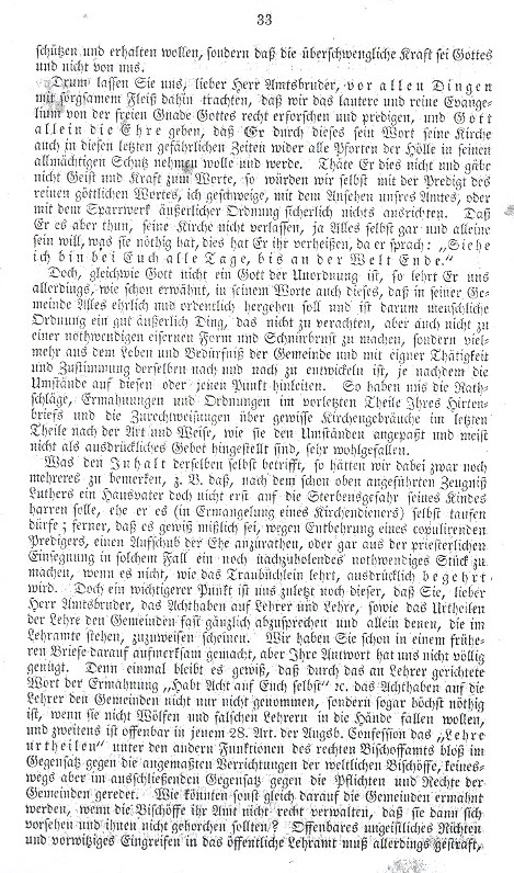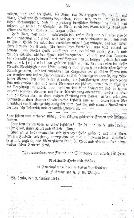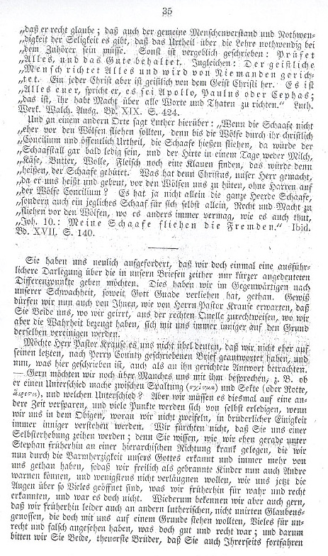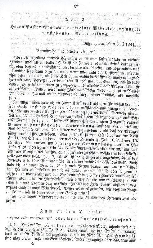 Pastor Grabau's considered Refutation of our Previous Critique Buffalo, July12, 1844 Respected and Beloved Brothers! Your critique of my pastoral letter is in my hands for almost a year now and for nearly half a year the response or anti-critique has been complete without my being able to transcribe or send it. I'll get to it now if the cry of new mutiny-minded people doesn't make it necessary for me to put your critique back in the strongbox. Pastor Ehrenström has not yet arrived and I have six congregations to care for and besides this eight candidates to instruct. I know that in your indulgent love you will forgive me. In general in your critique I preceived the absence of ecclesiastic reasons which first provide proof of each point coming from God's word before it is introduced as human testimony. Furthermore you provide nothing but Luther's testimony without showing anything coming from God's word. Not only this but in introducing most of Luther's testimony there is a misunderstood application to the pastoral letter. From 2 Timothy 2, 2 we know nothing further than that a preacher must be capable of teaching. You cite Matthew 15, 9 merely to settle your own case, not that of the pastoral letter. You cite John 10: 2, 1 and Corinthians 10, 15 only to refute your individual interpretation concerning the pastoral letter. And again you cite Hebrews 4, verse 12 only in order to reduce the ministry to service of the eucharist, which does not lie within the scriptural passage. John 7: 46, 49 is inappropriately cited, for the pastoral letter does not consider the congregation a damned and unknowing people. I also have to point out that you use "when or if" in many of your interpretations, as it thus often states: if this is meant this way or that, then it is not right; and you often critique your own interpretations but not those in the pastoral letter. This method could only be disillusioning for you and mislead you from the true content of the pastoral letter. It would have been better merely to ask me questions such as what does this or that sentence mean? I shall again write down my responses according to the sections of the pastoral letter. Quis rite vocatus sit? or who is called to ordination? §1. We must understand the word of God, especially in the two epistles of St. Paul to Timothy and the epistle to Titus, because these are the best examples from which to discern what is being discussed. The symbols are not sources of knowledge or proof but rather testimony concerning that which may be proven in and believed of God's word. |