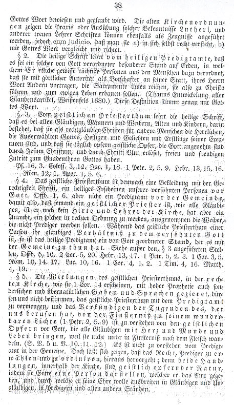 §13. It can never be necessary according to God's word that a local congregation must choose from its midsts or anywhere else an unprepared, unlearned, untested and therefore incapable man to be its minister. Proof: He, who believes and is baptised, shall be sanctified. Mark 16: Baptised, faithful Christians are made holy even when through misfortune they have no preacher for half a lifetime. However any Christian may give baptism, according to the word of Christ: "let the little children come to me;" and as it has been said to all Christians, also the old. In faith each believing housefather may raise up his children and his servants if he will only diligently deliver God's word and ask God for the grace to do so. If he perceives that he suffers harm to his soul due to the lack of a minister and souls are in danger, this is so because he demonstrates what the holy office is and what power resides in it, as it is, for example, with the immigrant Prussian Lutherans. If he is prevented from doing this or incapacitated, he may commend his soul and those under his care to God, and hold to the written word of God, |