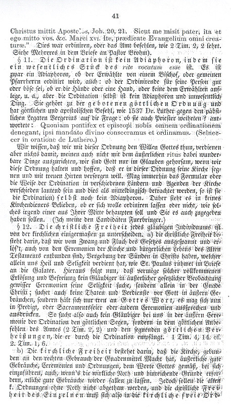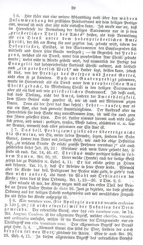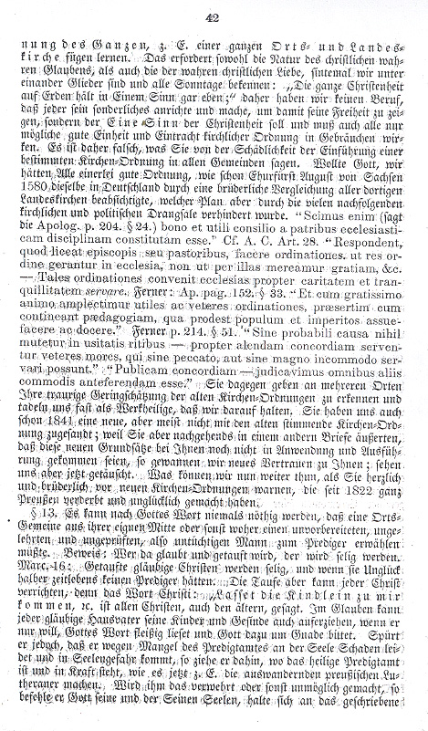 This calls for the nature of the Christian true believer as well as one of true Christian love if we are to be members along with others and profess every Sunday: The entirety of Christianity on the earth maintains itself in precisely this singular sense;" thus it follows that if there is no ordained vocation, then each individual may construct and create his own special circumstances in order to demonstrate his freedom and the singular sense of Christianity should and must produce mere possibly good unity and harmony of church ordering in customs. Therefore it is false, what you say about the harmfulness of the introduction of a particular church order among all congregations. It was God's wish that we all have one good order as Crown Prince August of Saxony intended in 1580 in Germany through a fraternal paralleling of all the churches in the province, however this plan was impeded by much subsequent ecclesiastic and political oppression. "Scimus enim (the Apology, p. 204 §24 states) bono et utili consilio a patribus ecclesiasticam constitutam esse." See also Augsburg Confession, Article 28. "Respondent, quod liceat episcopis seu pastoribus, facere ordinationes ut res ordine gerantur in ecclesia, non ut per illas mereamur gratium, etc. — Tales ordinationes convenit ecclesias propter caritatem et tranquillitatem servare." Further: Apology, p. 152 § 33. "Et cum gratissimo animo, amplectimur utiles ac veteres ordinationes, praesertim cum contineant paedagogiam, qua prodest populum et imperitos assuefacere ac docere." Further, p. 214 § 51. "Sine probabili causa nihil mutetur in usitatis ritibus — propter alendam concordiam serventur veteres mores, qui sine peccato, aut sine magno incommodo servari possunt." "Publicam concordiam — judicavimus omnibus aliis commodis anteferendam esse." You, on the other hand, profess your tragic scorn of the old church orders to many districts and call us hypocrites since we maintain them. In 1841 you even sent us a new church order, for the most part not in keeping with the old church order; and because you subsequently declared in another letter that these new principles had not yet been applied and executed, we developed a renewed confidence in you; we see now that we were deceived. What else could we do but warn you in a heartfelt and brotherly fashion about these new church orders, which since 1822 have completely corrupted and plagued Prussia.