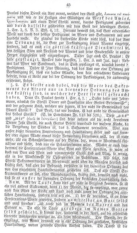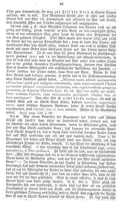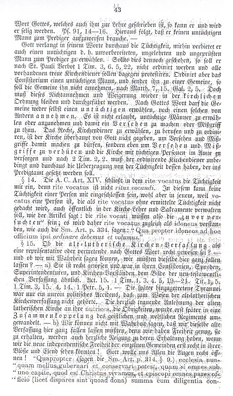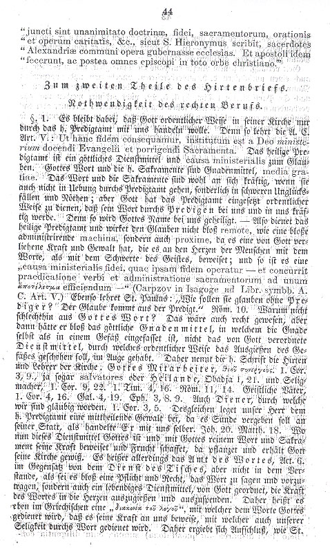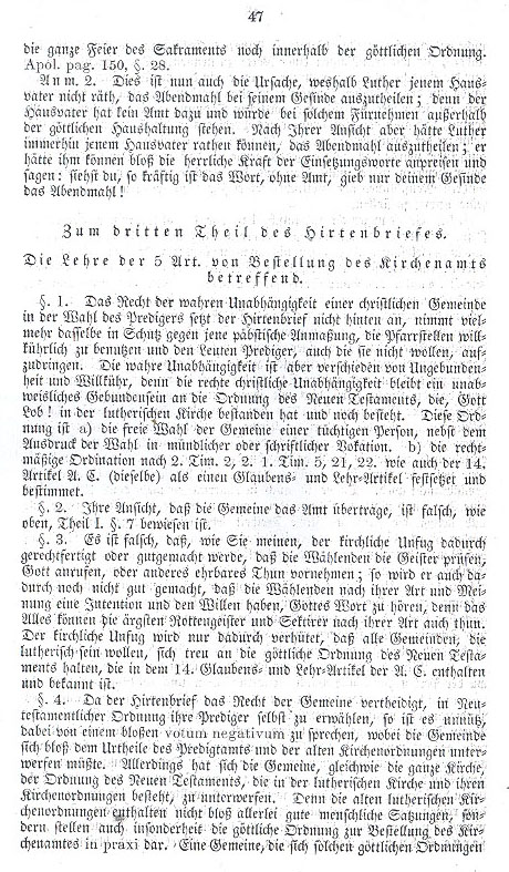 § 2. Your opinion, that the congregation conveys the office, is false as cited above, Part I, § 7 proves. § 3. It is false that, as you say, ecclesiastic misconduct will be rectified or made good by the choosers testing the spirit, calling upon God or assuming other noble tasks; the misconduct is also not made right by the choosers having the intention and the will to hear God's word, for all this can be done by the most wicked mutineering spirit and sectarian in his own way. Ecclesiastic misconduct would thus prevent all congregations, who will be Lutheran, from holding truly to the divine ordering of the New Testament, which is contained and acknowledged in the 14 articles of faith and teaching. § 4. Whereas the pastoral letter upholds the right of the congregation to choose its preacher within the New Testament ordering, it is useless to speak of the mere votum negativum by which the congregation must submit to the decision of the ministry and the old church orders. Among other things the congregation, as well as the entire church, has to submit to the ordering of the New Testament, which exists in the Lutheran church and its church orders. The old Lutheran church orders do not just contain rules for good human conduct but also specifically represent the divine order concerning the place of the church ministry in practice. A congregation, which will not submit to such divine orders, |