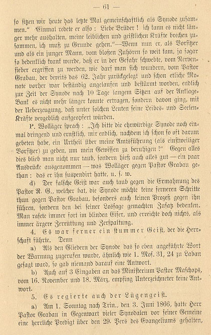 Just as at one time a false spirit had resided in the prophets of Ahab, 2 Chronicles 18, 21, so too did one prevail in the June 1866 Synod in Buffalo. Indeed it still leads within the hierarchy. Thus I can do nothing other than resign from the party (as Pastor Grabau did on June 7, 1866), which revels in this false spirit and stirs such a smokescreen, so long as this party continues in this vain.