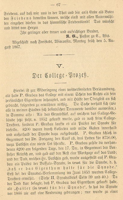 b) Pastor von Rohr, who tried in vain to snatch the church, the schoolhouse and the parish residence by worldly authority from his agelong friend, Pastor Grabau and his congregation, was interred in a grave, which he had made for another, as the Word of the Lord states in Psalms 7, 16.