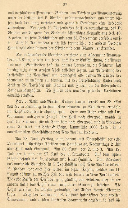 On May 28th Mr. von Rohr and Martin Krüger were elected deputies by the assembled congregation in Hamburg to finish the negotiations for the contract of ship passage. Mr. von Rohr traveled with Dr. Gustiniani and Mr. Frenzel via Hull to Liverpool and in Liverpool they signed a contract with Becket & Son to transport the 1000 souls in 5 American sailing ships to New York.
