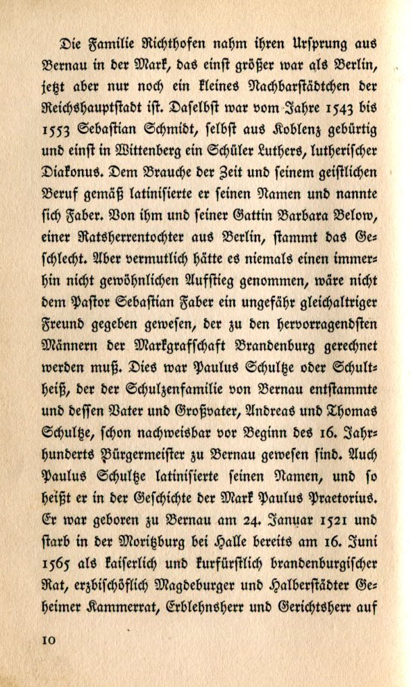 | The Richthofen family originally came from Bernau in the Mark, which at one time was larger than Berlin. Now it is merely a small township neighboring our capitol city. Sebastian Schmidt, born in Koblenz and once a student of Luther's in Wittemberg, was a Lutheran deacon in Bernau from 1543 to 1553. As was the custom of the time and his clerical profession, he latinized his name and called himself Faber. It is from him and his wife, Barbara Below, daughter of a councilman from Berlin, that the Richthofen family sprang. Most certainly his rise in social status would not have occurred if Pastor Sebastian Faber had not had a friend of roughly the same age, who was part of the Brandenburg elite. His name was Paulus Schultze or Schultheiss, who came from the Schulz family of Bernau and whose father and grandfather, Andreas and Thomas Schulzte had been mayors of Bernau since before the beginning of the 16th century. Paulus Schultze also latinized his name and was thus called in the written records of the region Paulus Praetorius. He was born in Bernau on January 24, 1521 and died in Moritzburg near Halle on June 16, 1565 as Brandenburg imperial councilman, secret privy counselor to the archbishop of Magdeburg and Halberstadt, heredity lord and court officer |