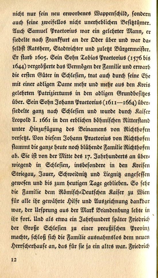 | not only his newly acquired coat of arms but also his rather substantial property holdings. Samuel Praetorius was a learned man. He settled in Frankfurt on the Oder and became a councilman, a city judge, and eventually the mayor. He died in 1605. His son, Tobius Praetorius (1576-1644) increased the family's finances and acquired an estate in Silesia. Through his marriage to a noblewoman he entered into a ever increasing circle of learned patricians with royal estates. His son, Johann Praetorius (1611-1664), moved permanently to Silesia. In 1661 Kaiser Leopold I bestowed Bohemian hereditary knighthood upon him and "von Richthofen" ["from the Court of Judgment"] was added to the family name. Today's burgeoning von Richthofen family descends from Johann Praetorius von Richthofen. From the middle of the 17th century to today the family has resided in Silesia, particularly in the Striegau, Jauer, Schweidnitz and Liegnitz areas. As grateful as the family was to the Holy Roman Emperor in Vienna for all his help and honors, its Brandenburg ties still lived on. When about a century later Frederick the Great annexed Silesia to become a Prussian province, the family gained a new domain, which for them was old and familiar. |