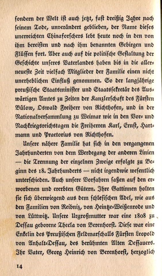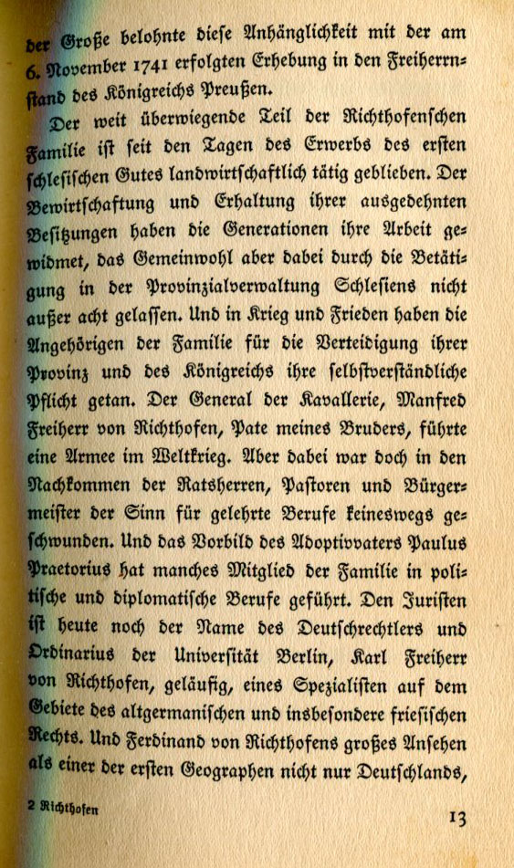 The better portion of the von Richthofen family has remained active in agriculture since the days of the acquisition of the first Silesian estate. The generations have dedicated themselves to the management and maintenance of the estates entrusted to them while at the same time promoting the common good through their activities in the provincial government of Silesia. In war and peace members of the family have done their duty in defense of their province and empire. General of the Cavalry Manfred, Baron von Richthofen, who was my brother's godfather, led an army in the World War. However within the decendents of these councilmen, pastors and mayors the desire for learned vocations has never disappeared. In imitation of our adopted forefather Paulus Praetorius many members of the family have become politicians and diplomats. Even today the name of German law professor from the University of Berlin Karl, Baron von Richthofen is still known to jurists specifically for his expertise in the field of old German and especially Friesian law. And Ferdinand von Richthofen's great reputation as one of the first geographers not only of Germany |