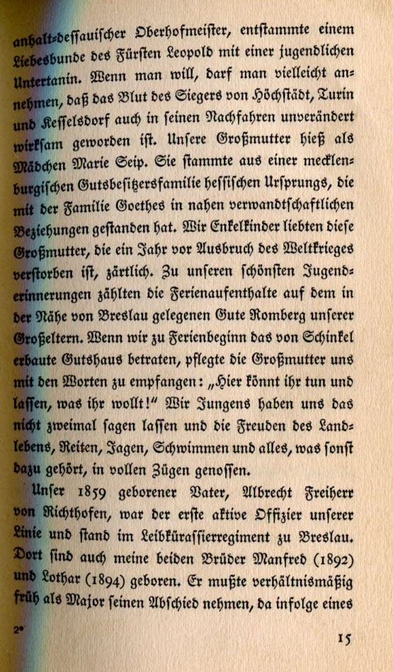 was a senior court minister to the Duke of Anhalt-Dessau. He descended from a love match between Prince Leopold and a young subject. One may even believe that the blood of the victor of Höchstädt, Turin and Kesselsdorf still flows pure in his descendents. Our grandmother's maiden name was Marie Seip. She came from a family with estates in Mecklenburg but they were of Hessian origin which stood in close relationship with the Goethe family. We grandchildren dearly loved our grandmother, who died in the year the World War broke out. Our fondest childhood memories revolve around vacation stays at our grandparents' Romburg estate near Breslau. At the beginning of our stay in that shingled farmhouse our grandmother used to say, "Here you can do anything you like!" You didn't have to tell us boys twice. The pleasures of country life - riding, hunting, swimming and everything else it entails - were enjoyed in full measure.